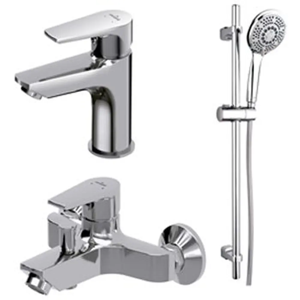 Представлений набір змішувачів для ванної кімнати 3-в-1 від Cersanit складається зі змішувача для умивальника VERO, змішувача для ванни-душу VERO і душового набору SENTI.