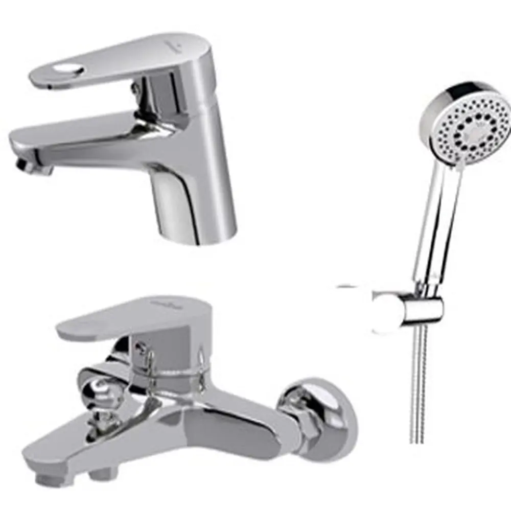 Представлений набір змішувачів для ванної кімнати 3-в-1 від Cersanit складається зі змішувача для умивальника CARI, змішувача для ванни-душу CARI і душового набору LANO.