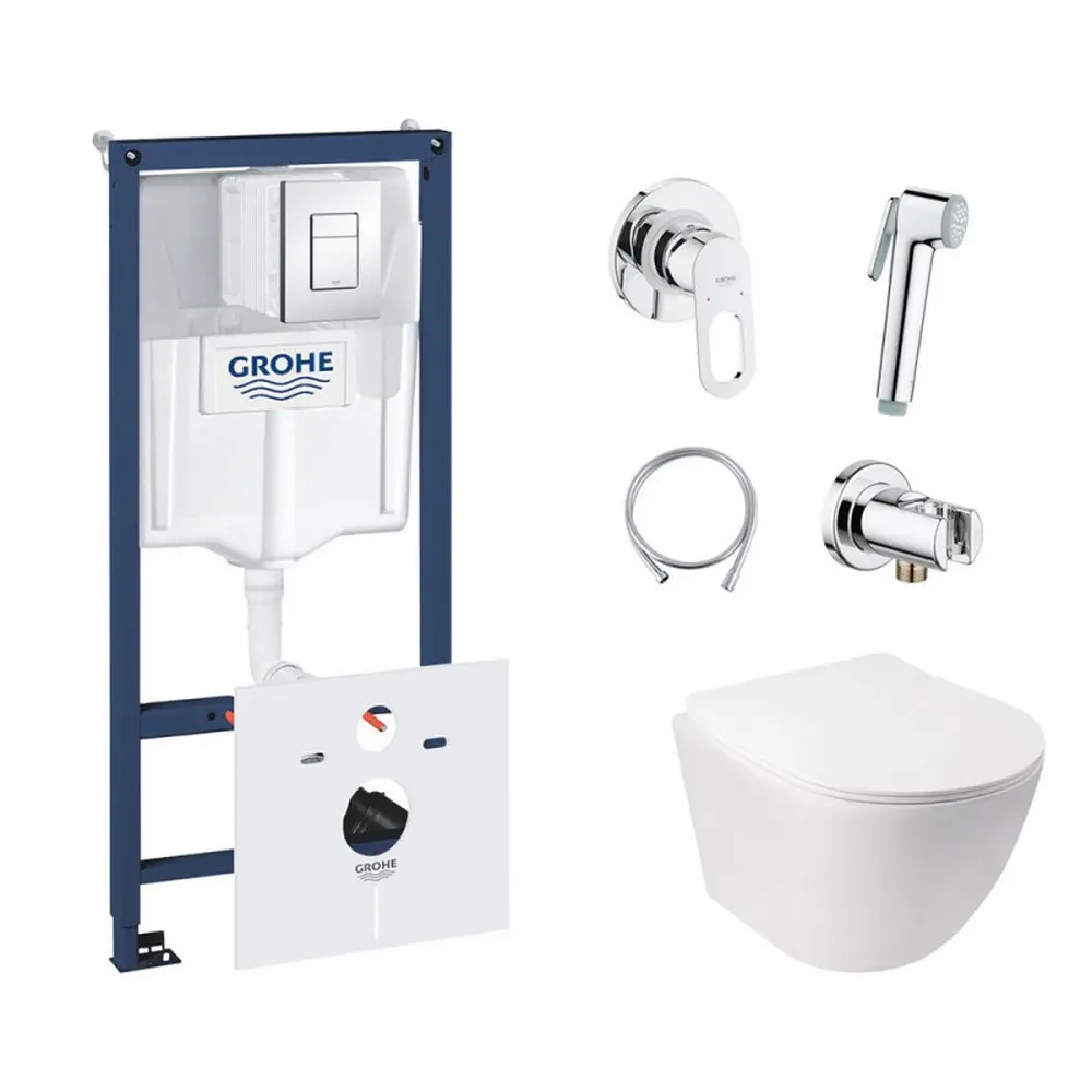 Комплект унітаз з сидінням Qtap Jay WHI 5176 + інсталяція Grohe Rapid SL 38827000 + набір для гігієнічного душу зі змішувачем Grohe BauLoop 111042 є надійним і практичним доповненням будь-якого сучасного санвузла й відмінним рішенням поліпшення рівня гігієнічних процедур. Комплект складається з якісного та зручного унітаза з сидінням, надійної інсталяційної системи з панеллою змиву, а також гігієнічного душу зі змішувачем, що дозволить розширити функціонал санвузла в цілому.