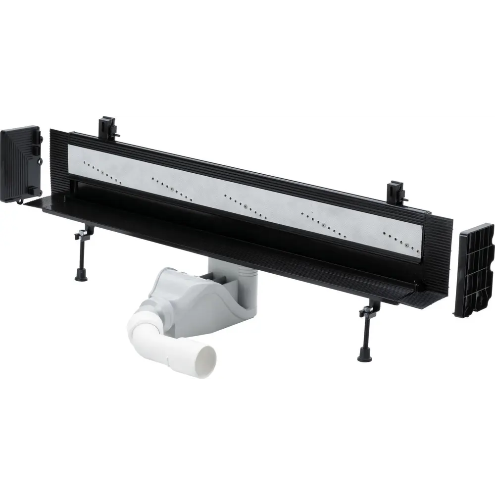 Душевой лоток Advantix Vario может быть установлен в трех разных вариантах. Например, как прямолинейный элемент в произвольном месте помещения или непосредственно в стене. Дополнительно возможно его угловое исполнение или П-образная форма по периметру всей душевой зоны. По высоте душевой лоток также имеет большой диапазон регулировок. Он может быть установлен высотой от 90 до 165 мм, причем даже при минимальной монтажной высоте перепад высот между сливным патрубком и основой составляет 25 мм. При соблюдении минимального уклона возможна прокладка соединительных трубопроводов длиной 2,5 м без необ-ходимости подъема душевого лотка. Пропускная способность в зависимости от монтажной высоты конструкции составляет от 0,4 до 0,8 л / с и может быть удвоена путем соединения двух душевых лотков.
