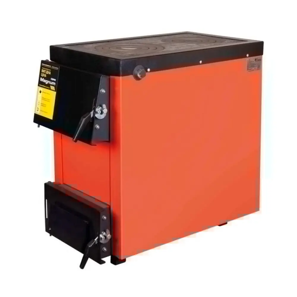 Котел твердопаливний Thermo Alliance Magnum SSF 20 з плитою розроблений для автономних водонаповнених опалювальних систем потужністю до 20 кВт. Це сталевий водогрійний пристрій з вбудованою варильною поверхнею на 2 конфорки. Колосники з чавуну, завантаження палива — ручне. Дверцята обслуговування котла можна регулювати, передбачена можливість зміни щільності прилягання, сторони відкривання. Стінки корпусу подвійні, між ними — водяна сорочка. Теплоізоляція стін зроблена з мінеральної вати.
