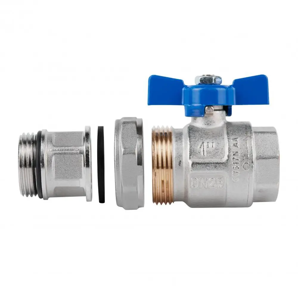 Повнопрохідний кульовий кран ICMA Арт. 215 1" c американкою. Кран оснащений ручкою типу «метелик» синього кольору, накидною гайкою з нарізним полусгоном, противибуховим штоком і подвійною прокладкою. Сфера застосування шарового крана - санітарія, системи опалення та охложденія. Корпус і "Американка" кульового вентиля ICMA виготовлений з високоякісного матеріалу - латунь CW617N - UNI EN 12165.