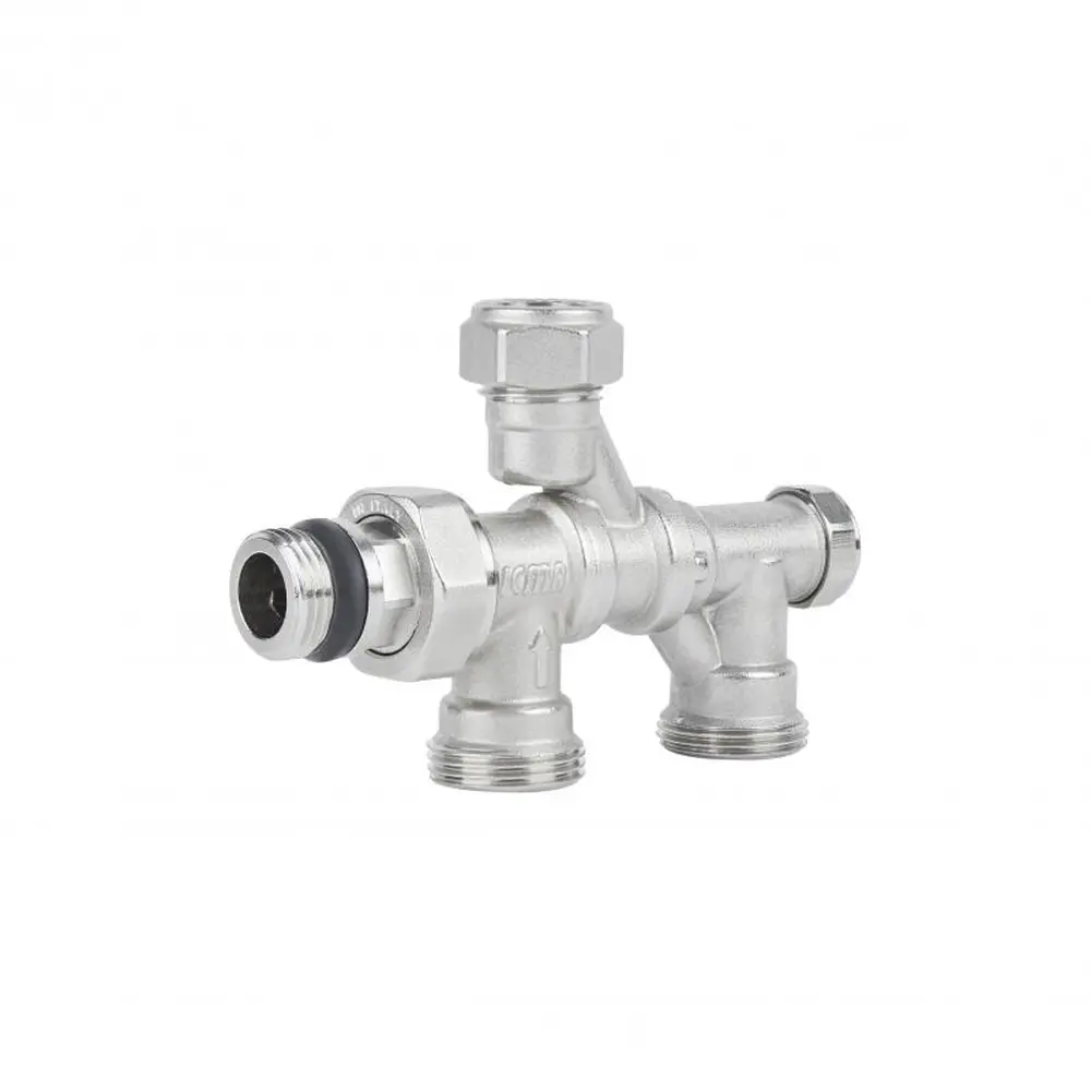 Четиреходовий вентиль з функцією перемикання режиму роботи з однотрубного режиму в двотрубний. Два обертових підключення до труби, що дають можливість підключати кран як напольно так і настінно. Корпус, американка і патрубок вентиля виготовлені з високоякісного матеріалу - латуні CW617N - UNI 12165 і має нікельоване покриття.