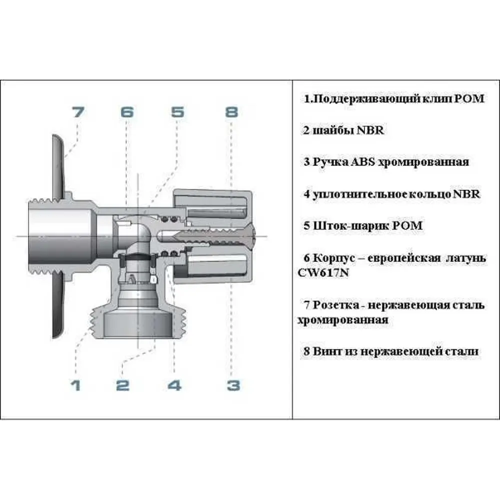 Корпус виробу виготовлений з високоміцної нікельованої латуні марки CW614N Euro. Крім того кран додатково хромований для високого порогу корозостійкості