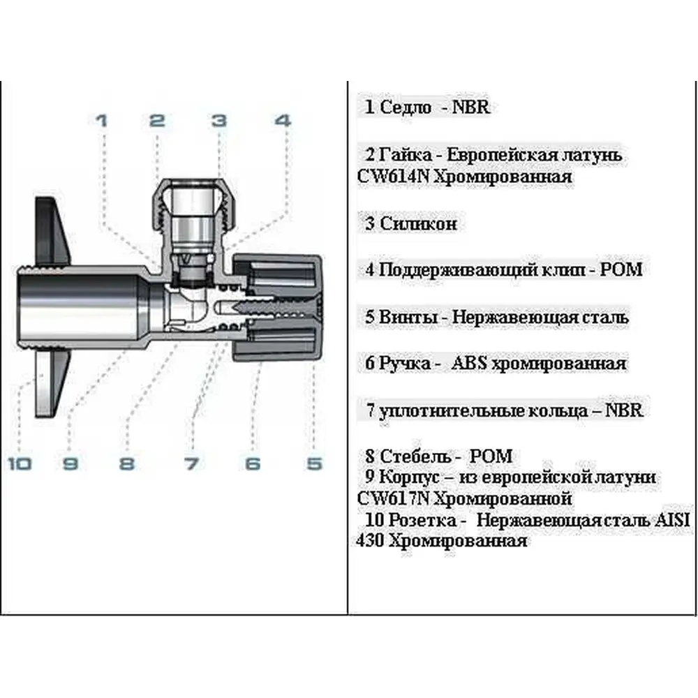 Корпус виробу виготовлений з високоміцної нікельованої латуні марки CW614N Euro. Крім того кран додатково хромований для високого порогу корозостійкості