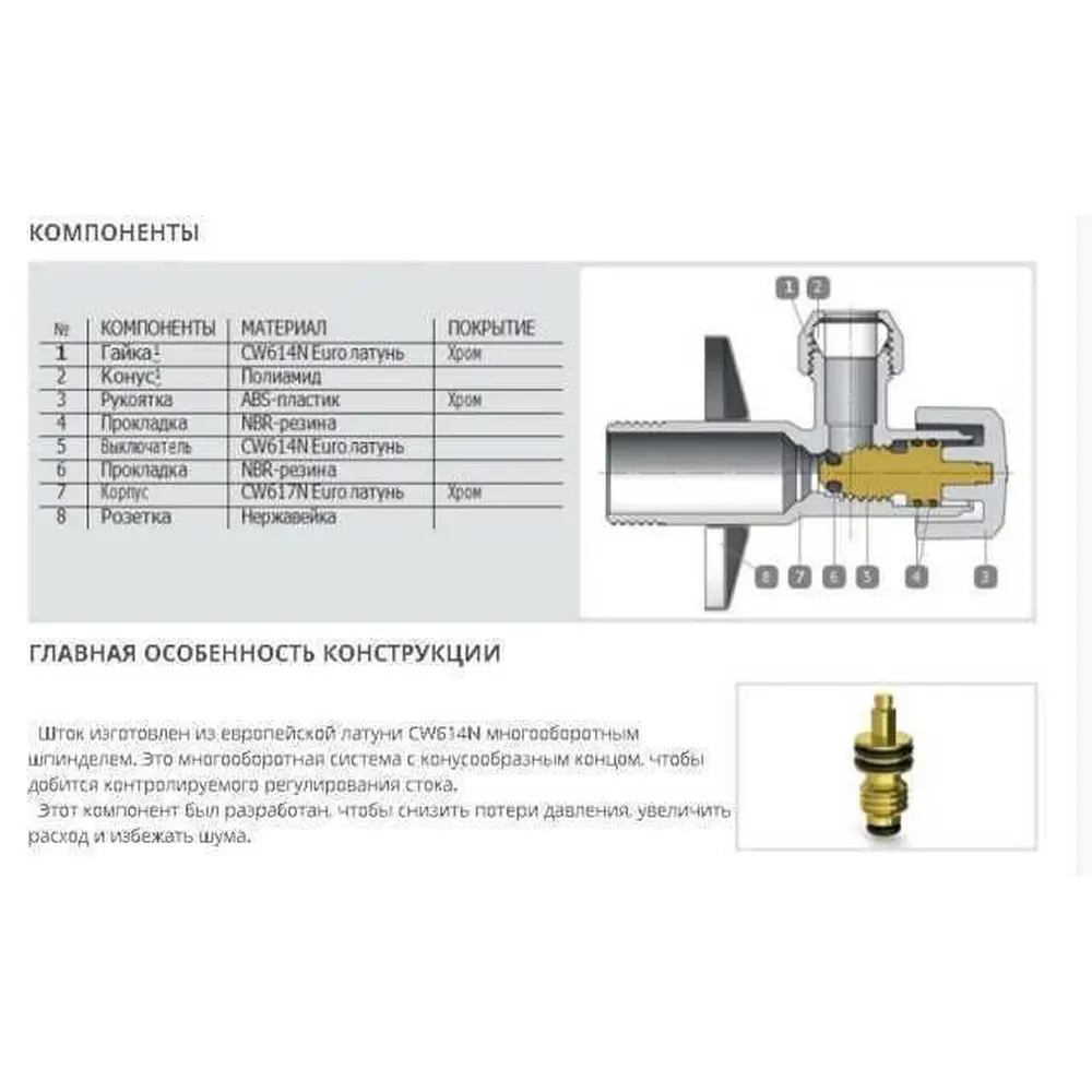 Корпус виробу виготовлений з високоміцної нікельованої латуні марки CW614N Euro. Крім того кран додатково хромований для високого порогу корозостійкості