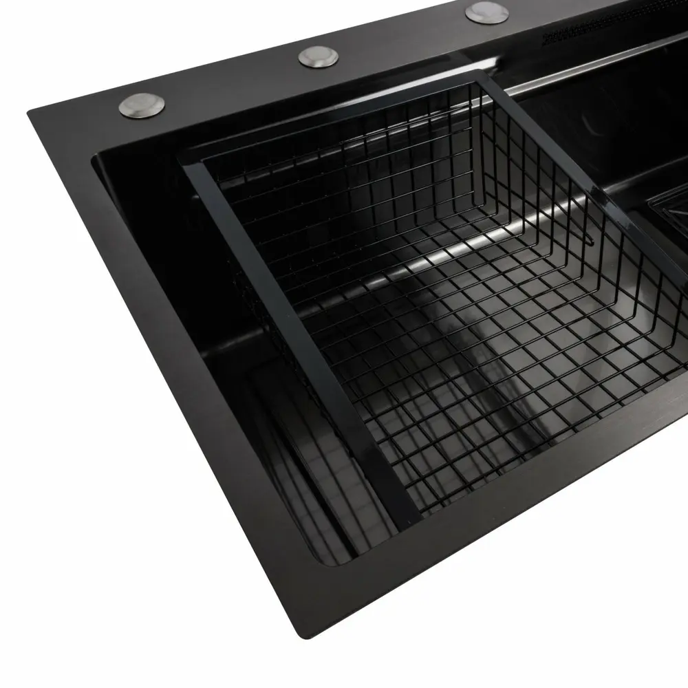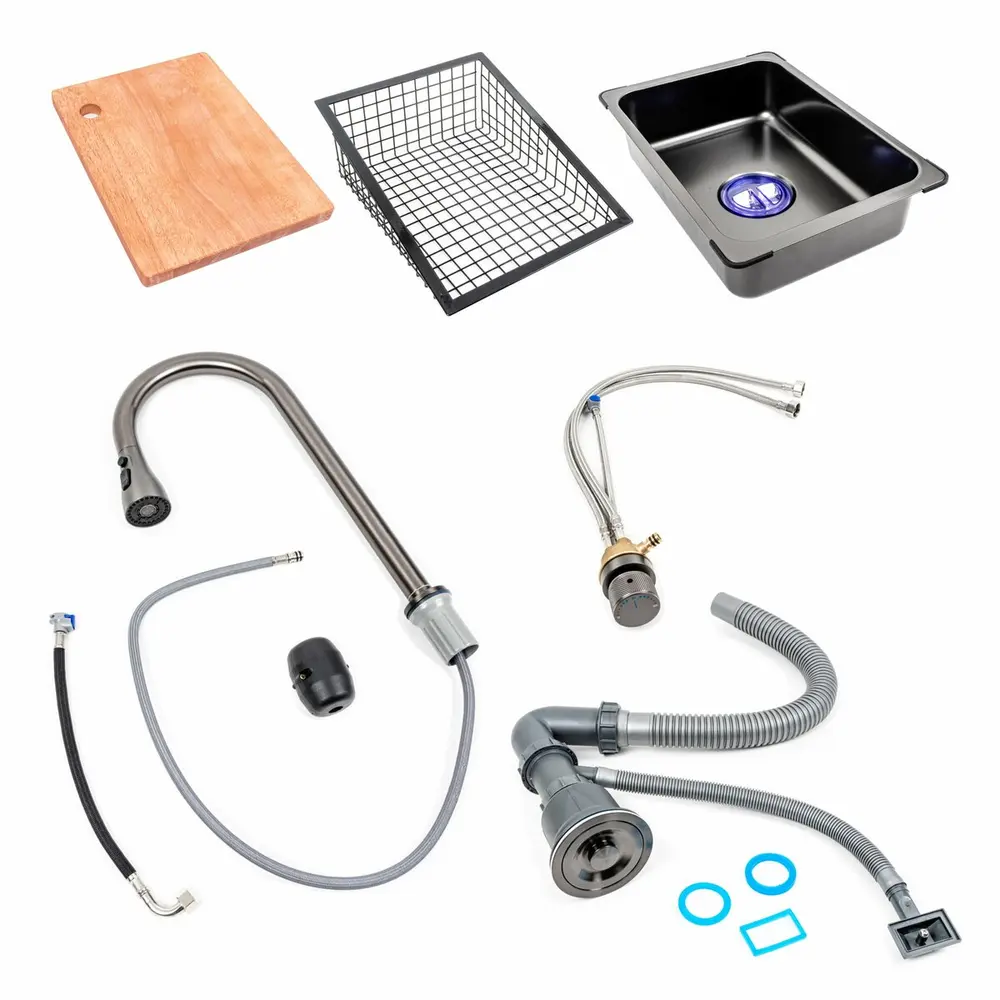 Накладная мойка имеет стильный черный цвет, а смеситель с гибким изливом и двухуровневым ступенчатым дизайном может быть перемещен вправо или влево внутри мойки, что позволяет экономить воду, время и усилия. Глубокая и просторная раковина позволяет разместить кастрюли без брызг и легко справиться с мытьем столовых приборов.