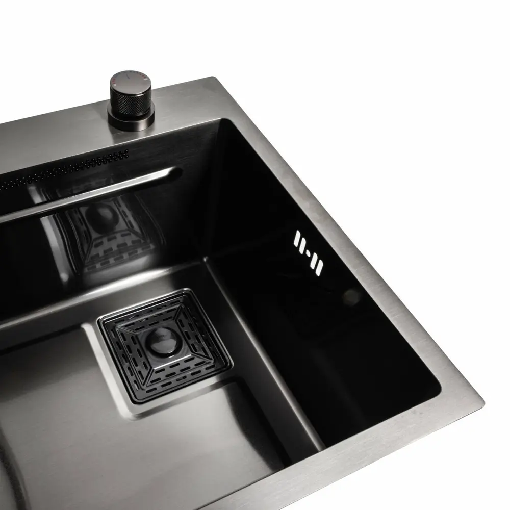 Смеситель выдвижной с душем, а также удобный режим водопада, что позволяет комфортно мыть фрукты, овощи и зелень. Мойка изготовлена из высококачественной нержавеющей стали SUS 201 с покрытием PVD, что обеспечивает ей особую прочность и стойкость к коррозии. Толщина борта мойки составляет 3 мм.