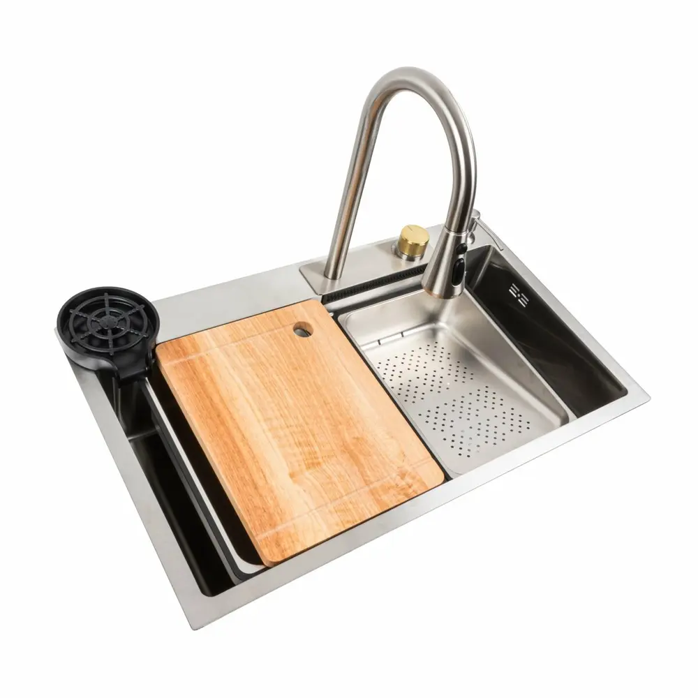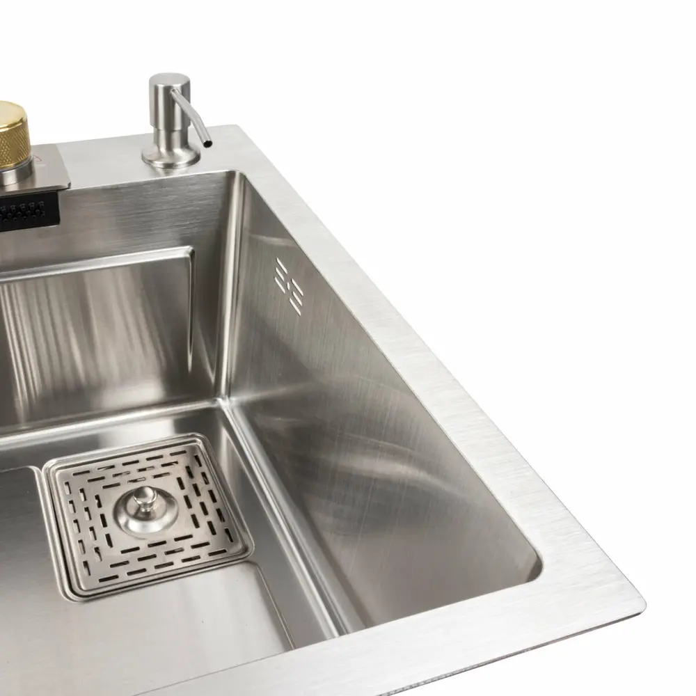 Смеситель выдвижной с душем, а также удобный режим водопада, что позволяет комфортно мыть фрукты, овощи и зелень. Мойка изготовлена из высококачественной нержавеющей стали SUS 201 с покрытием PVD, что обеспечивает ей особую прочность и стойкость к коррозии.