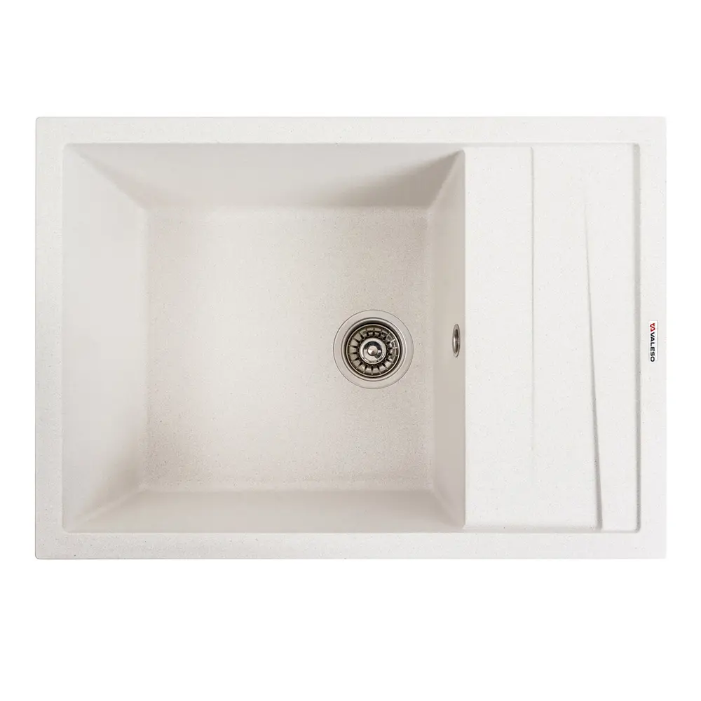 Гранитная мойка для кухни 7050 CASCADA цвета Белый в точку украинского бренда VALESO – это стильная, врезная, прямоугольная мойка, которая своим видом прекрасно дополнит дизайн вашей кухни. Мойка на 80% состоит из кварца и на 20% из очень жесткой акриловой смолы, благодаря чему неприхотлива в уходе, а также имеет большой запас прочности.
