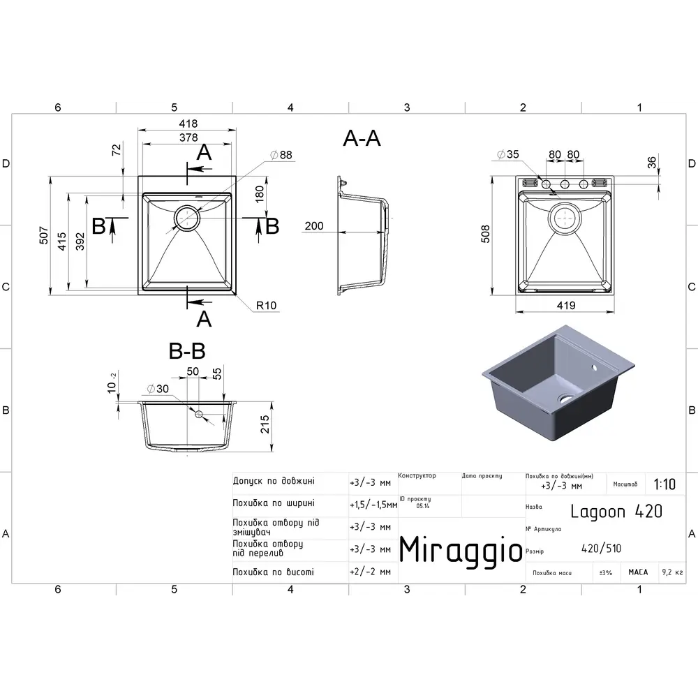 Кухонні мийки MIRAGGIO комплектуються сифонами італійського виробництва та кріпленням для монтажу мийки. На всі моделі надається гарантія 10 років від виробника.