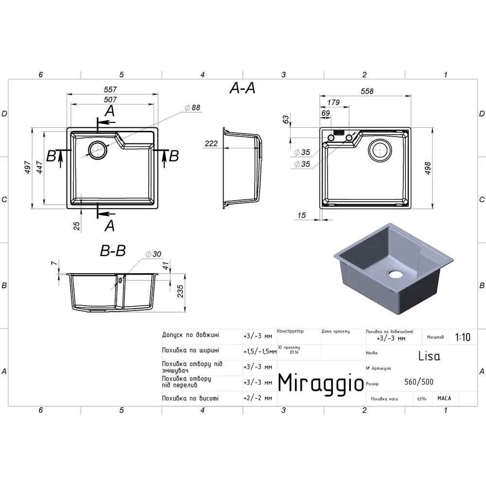 Кухонні мийки MIRAGGIO комплектуються сифонами італійського виробництва та кріпленням для монтажу мийки. На всі моделі надається гарантія 10 років від виробника.