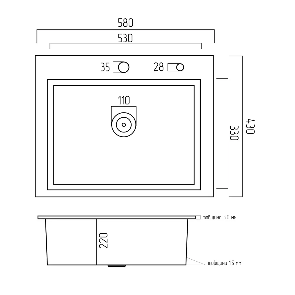 Мойка имеет чашу глубиной 220 мм, что обеспечивает удобство ежедневного использования. Тип установки – универсален, как на столешницу, так и под столешницу. Для монтажа мойки требуется ширина столешницы не менее 500 мм.