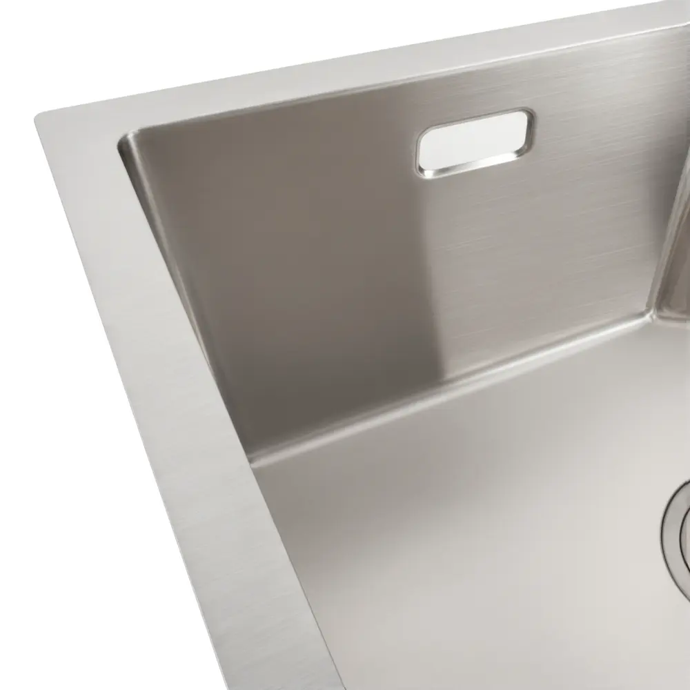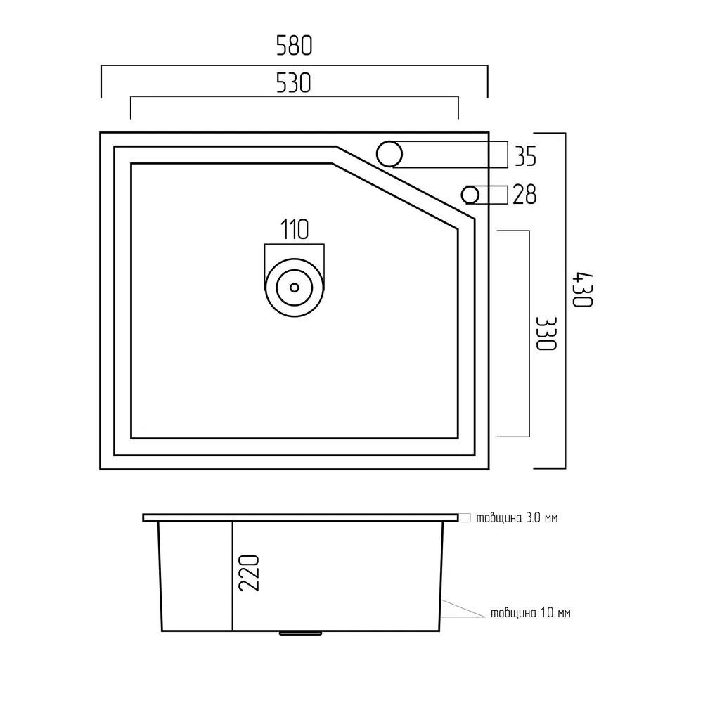 Мийка має чашу глибиною 220 мм, що забезпечує зручність щоденного використання. Тип встановлення – універсальний, як на стільницю так і під стільницю. Для монтажу мийки потрібна ширина стільниці не менше 500 мм.