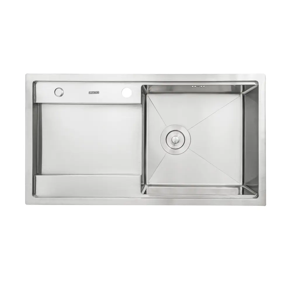 Кухонна мийка Platinum Handmade 82*45 це відмінне стильне рішення для кухні середніх та великих розмірів. Сучасний дизайн прямокутної форми добре пасує різним інтер’єрам кухні. Чаша з великою сушкою забезпечить зручне повсякденне використання мийки.