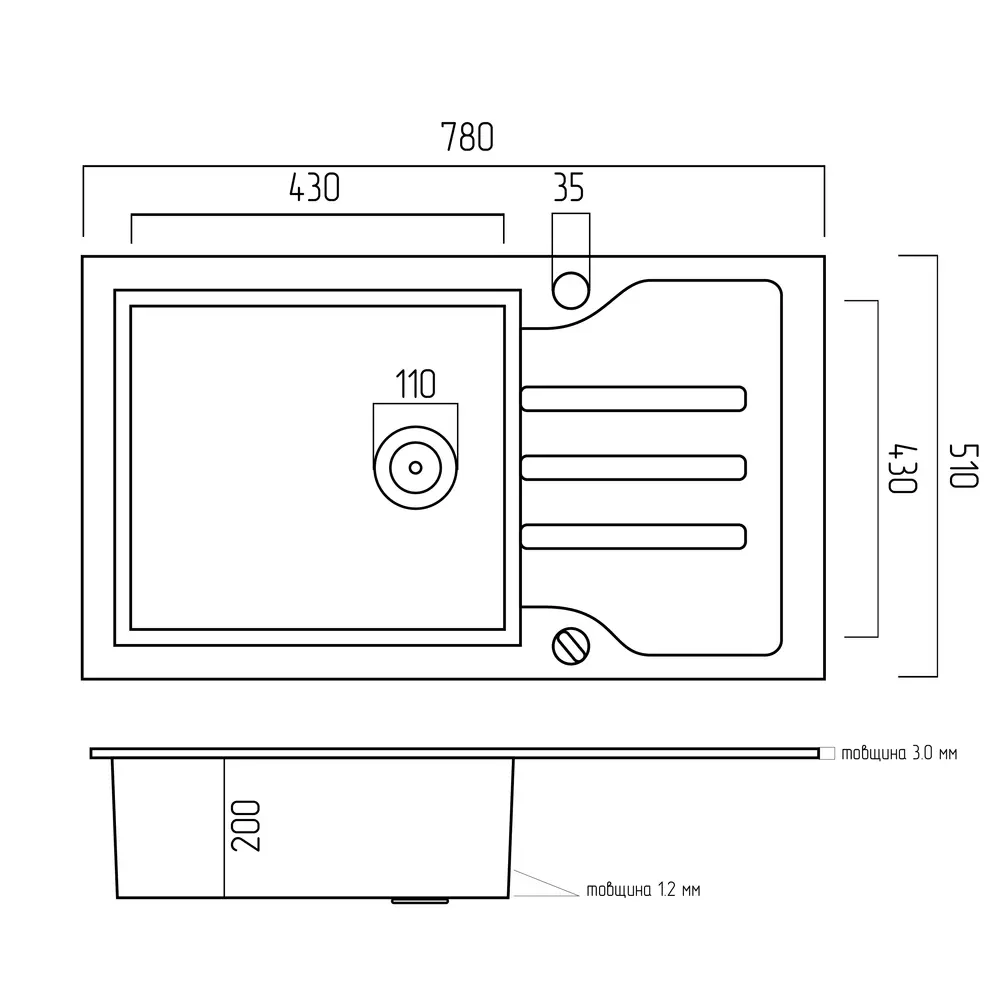 Мийка має чашу глибиною 200 мм, що забезпечує зручність щоденного використання. Тип встановлення – універсальний, як на стільницю, так і під стільницю. Для монтажу мийки потрібна ширина стільниці не менше 550 мм.