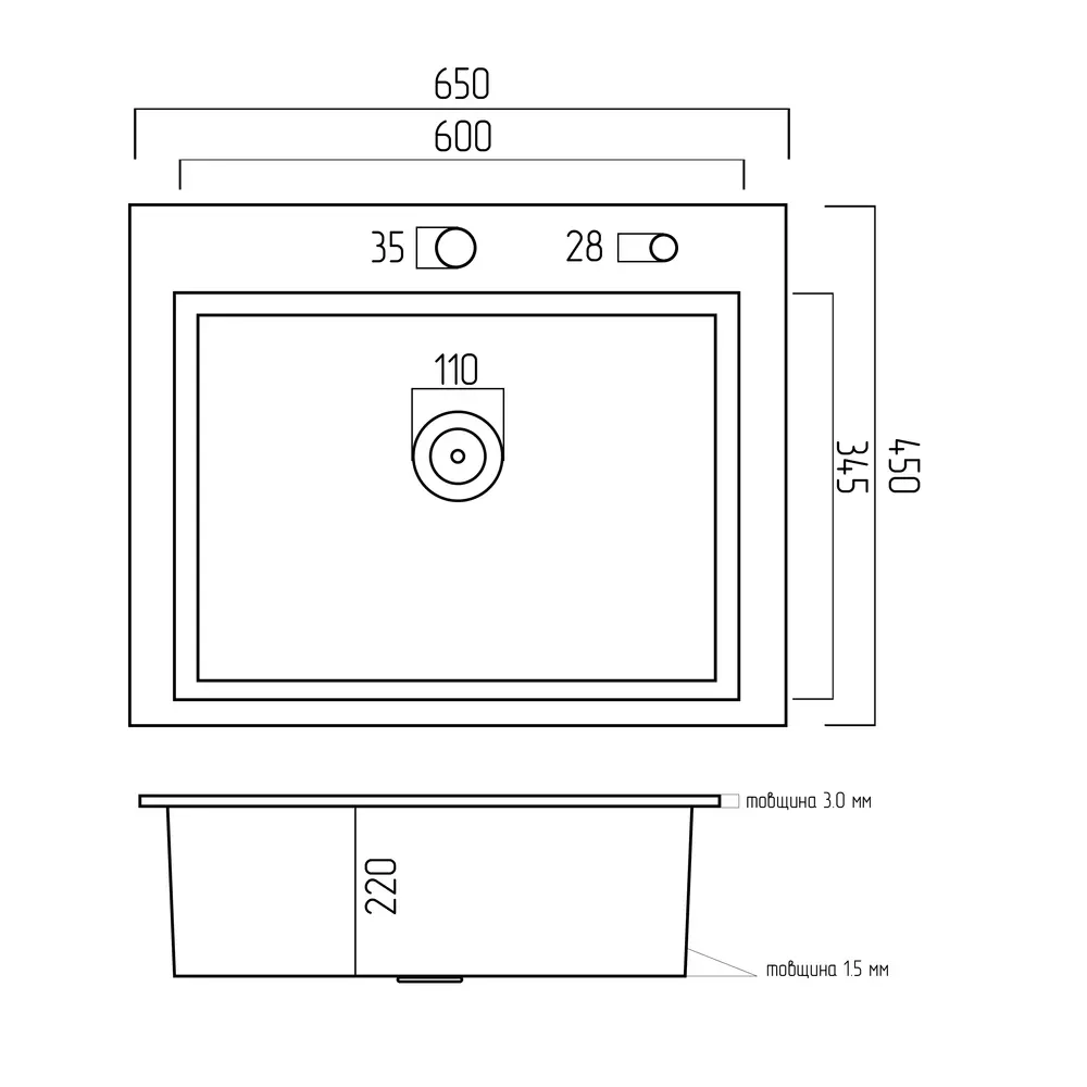 Мийка має чашу глибиною 230 мм, що забезпечує зручність щоденного використання. Тип встановлення – універсальний, як на стільницю так і під стільницю. Для монтажу мийки потрібна ширина стільниці не менше 500 мм.