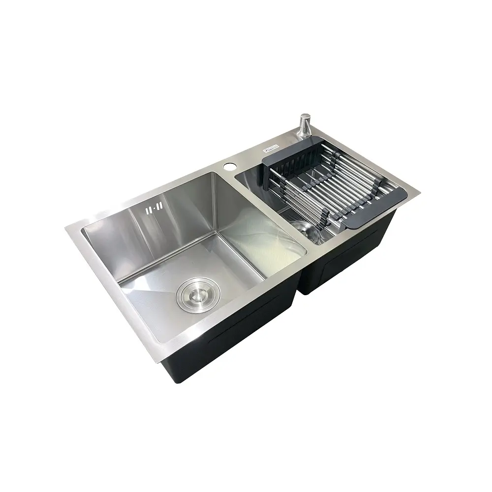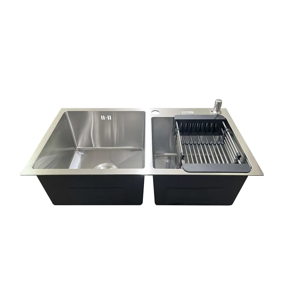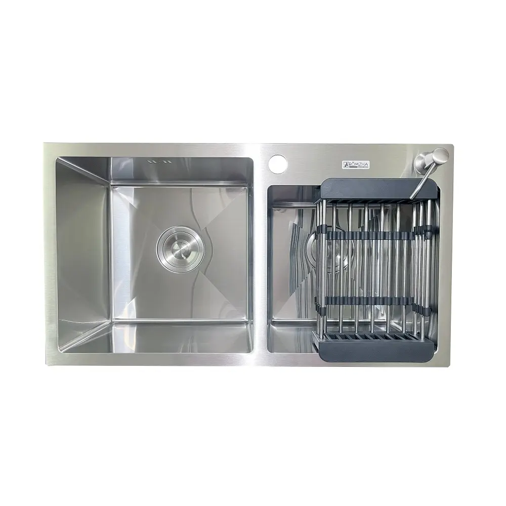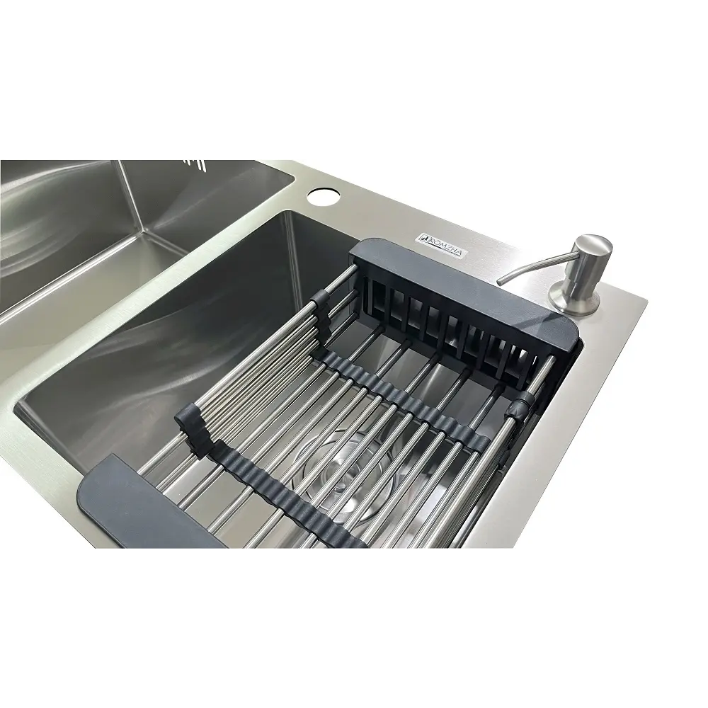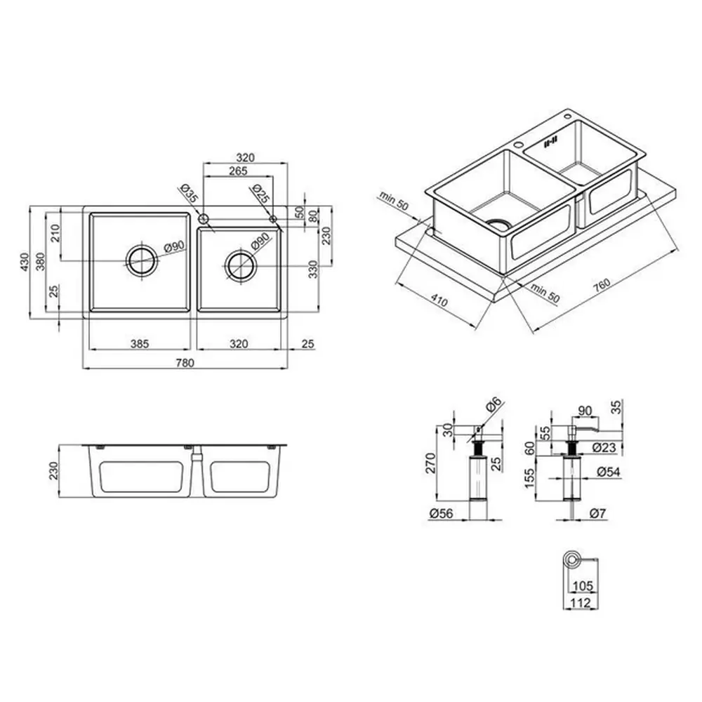 Комплектація: кухонна мийка, сифон, гофрований шлаг, корзина з нержавіючої сталі та дозатор рідких миючих засобів