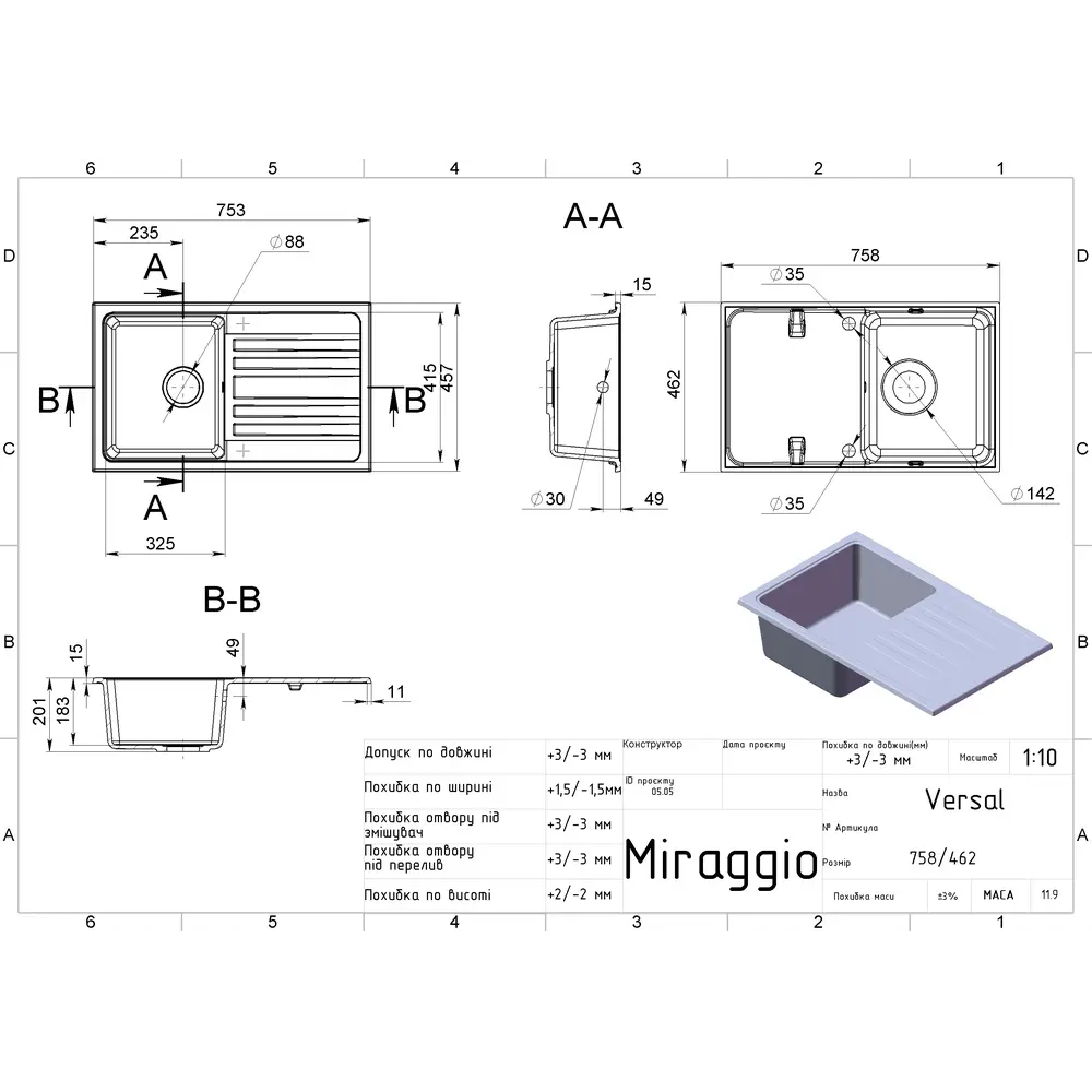 Кухонні мийки MIRAGGIO комплектуються сифонами італійського виробництва та кріпленням для монтажу мийки. На всі моделі надається гарантія 10 років від виробника.