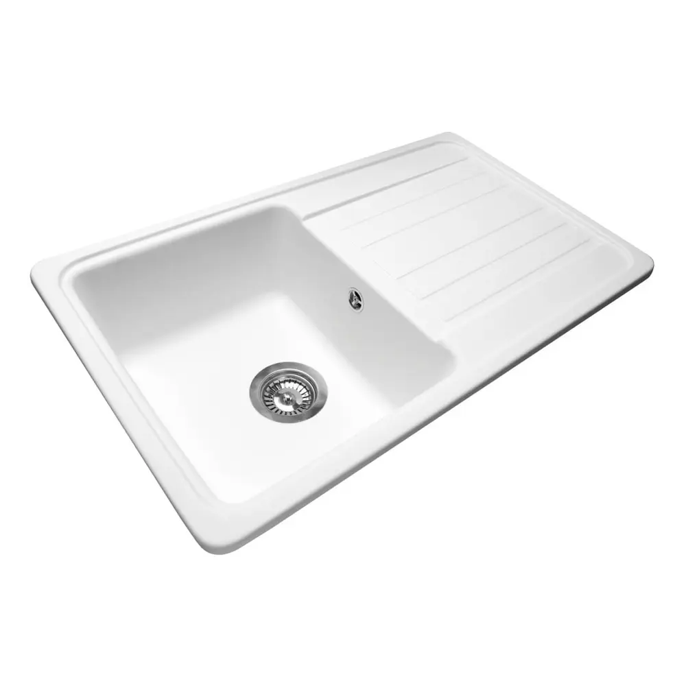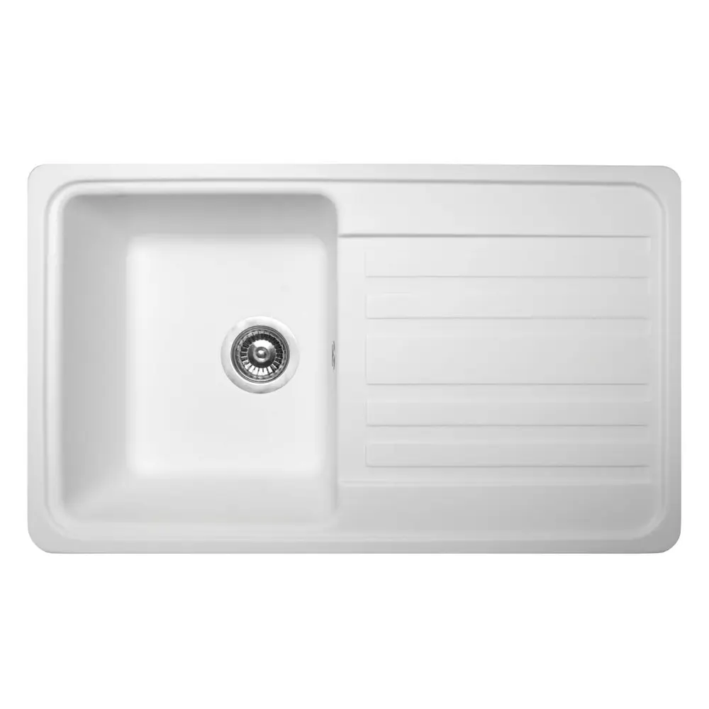 Кухонна мийка VERSAL white має однорідну текстуру та колір. Вона не всочує запахи, відштовхує жир та забруднення, а також не змінює кольору в процесі експлуатації.
