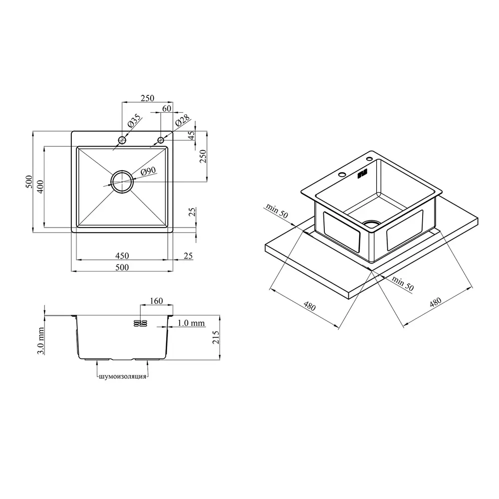 Красива, сучасна мийка зручного розміру 50х50 см з комплектом для встановлення. По сталі товста, по прибиранню легка. Рекомендую.