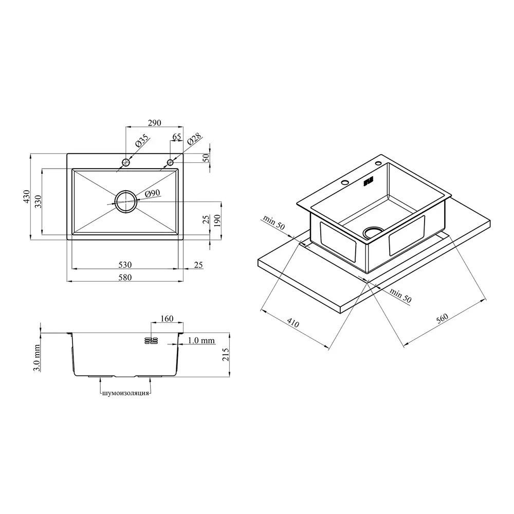 Нержавіюча сталь SUS201. Є отвір для дозатора миючого засобу.