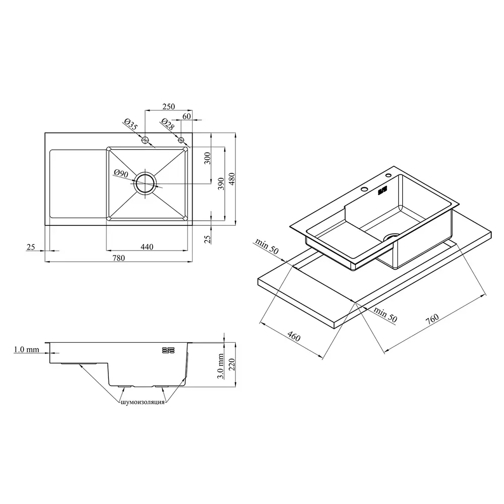 Кухонна мийка Kroner KRP PVD Schwarze - 7848RHM (3,0/1,0 мм)