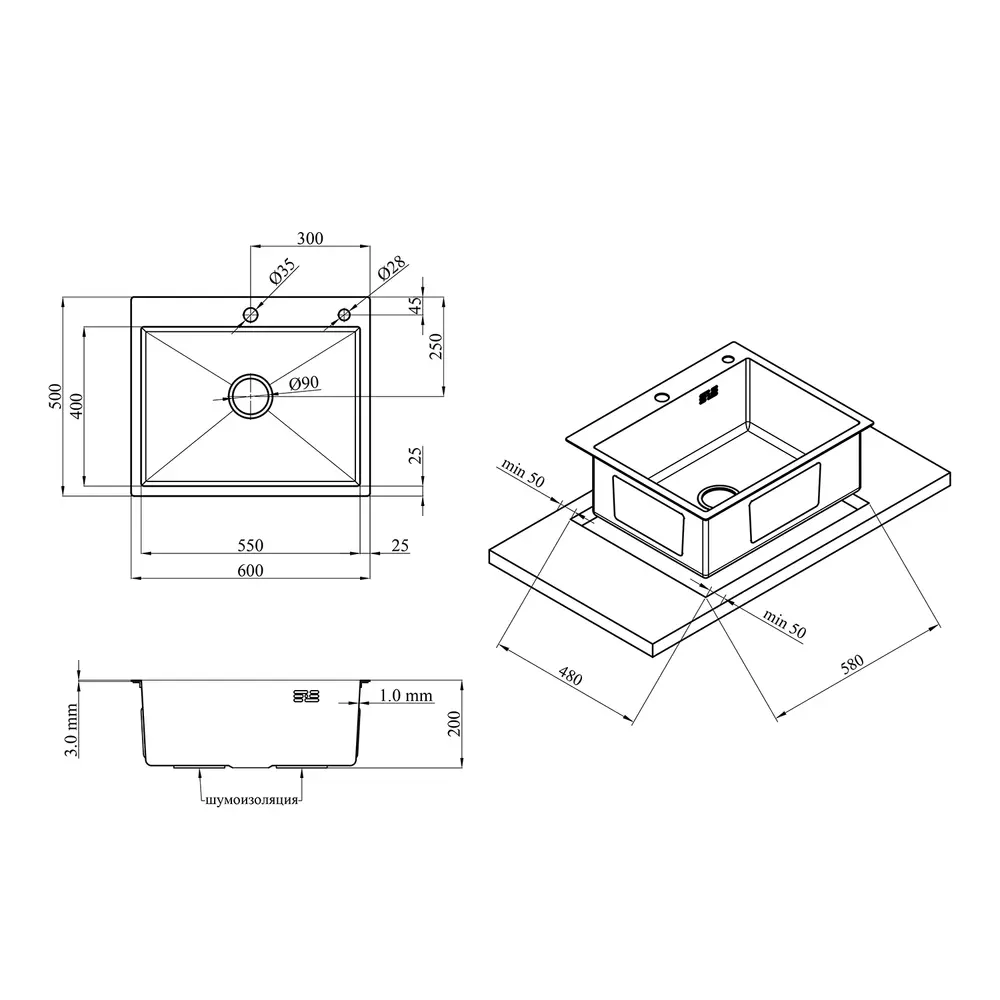 Нержавіюча сталь SUS201. Є отвір для дозатора миючого засобу.