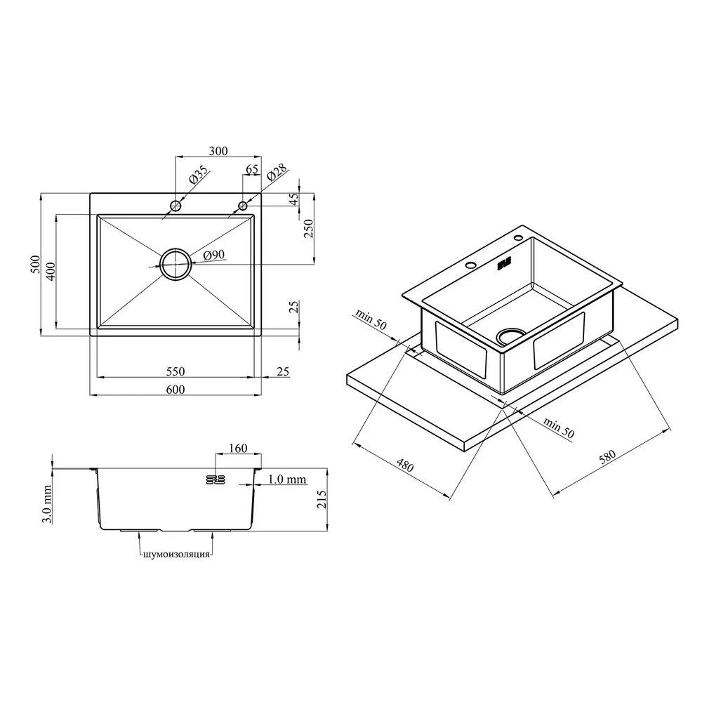 Нержавіюча сталь SUS201. Є отвір для дозатора миючого засобу.