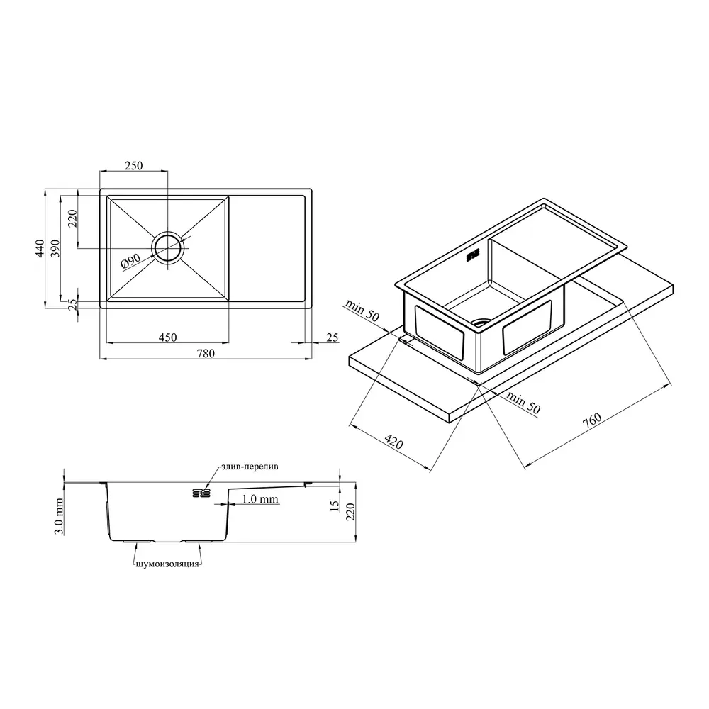 Мийка, сифон, злив-перелив, кошиковий вентиль, сушарка.