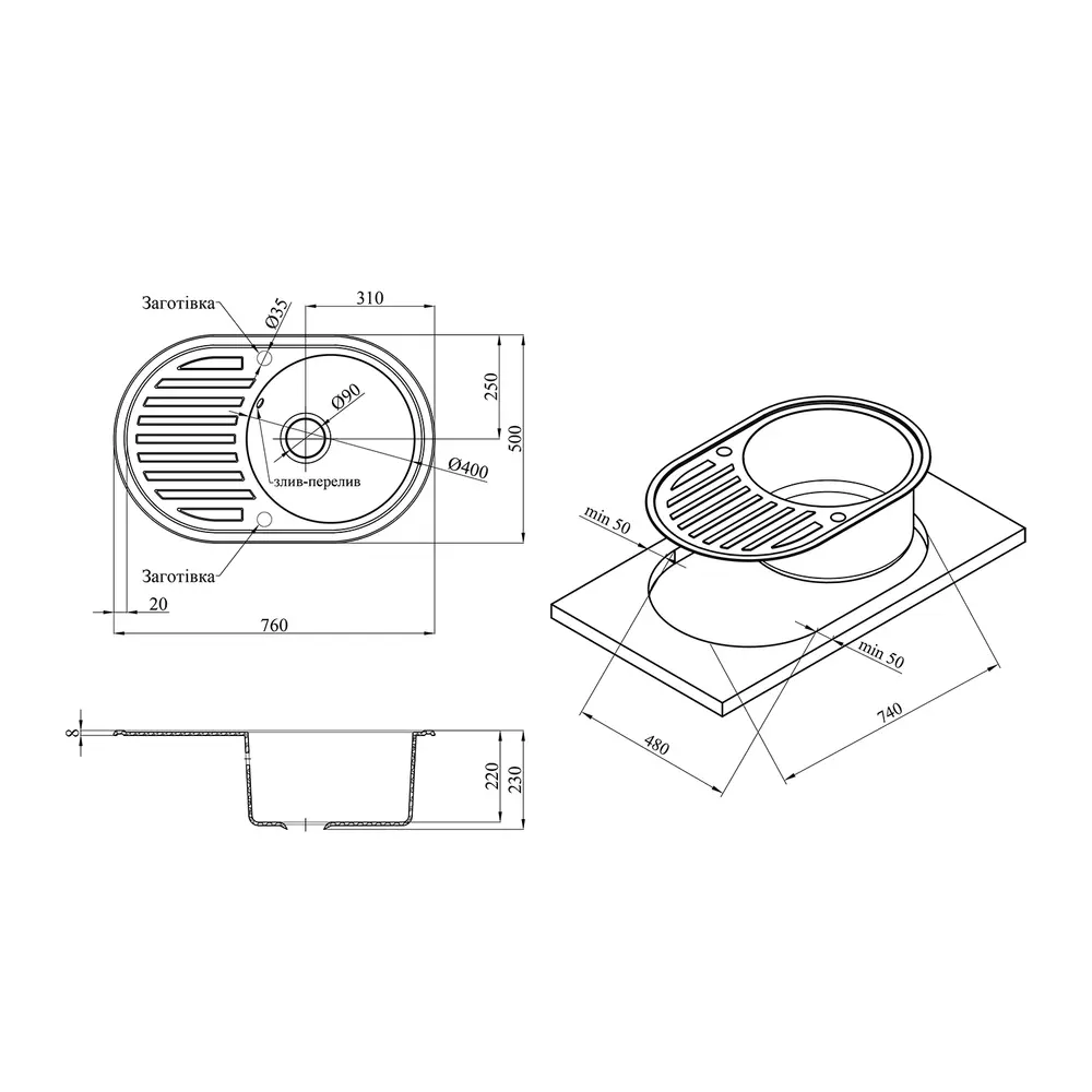 Мийка, сифон, злив-перелив, кошиковий вентиль, кріплення.