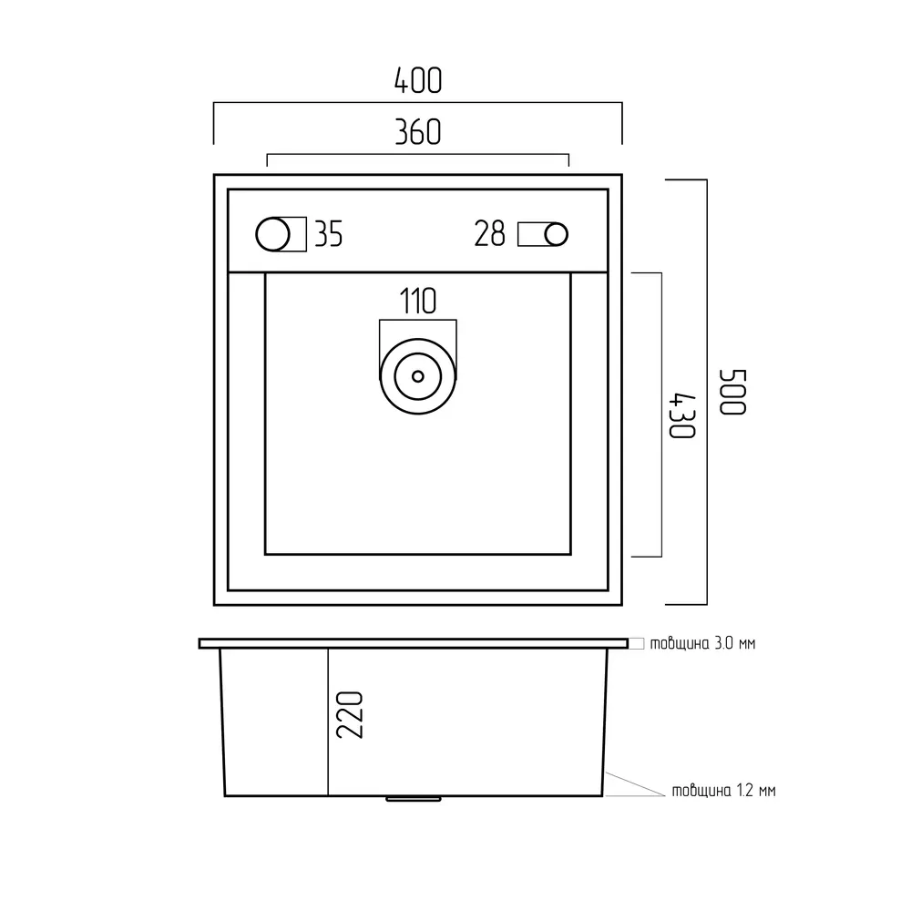 Мийка має чашу глибиною 200 мм, що забезпечує зручність щоденного використання. Тип встановлення – на стільницю. Для монтажу мийки потрібна ширина стільниці не менше 550 мм.