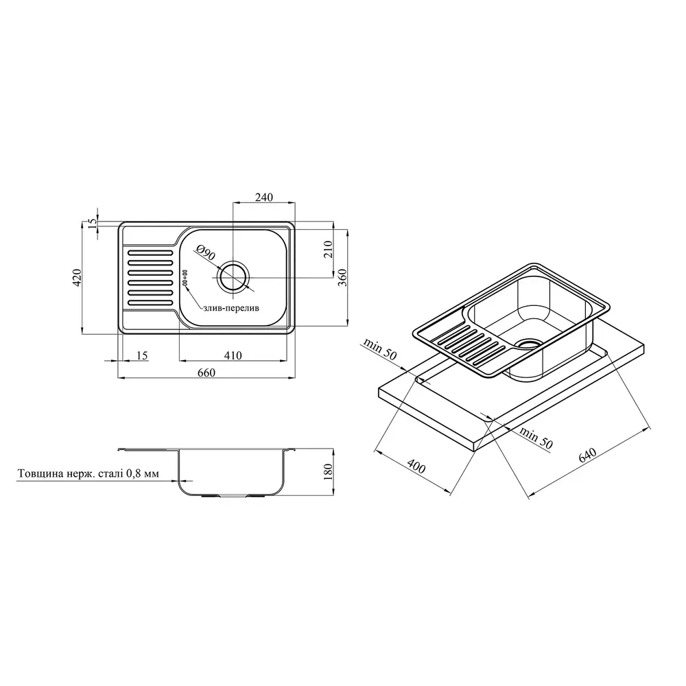 Мийка, сифон, злив-перелив, кошиковий вентиль, стрічка ущільнююча, кріплення.