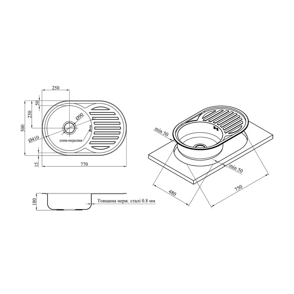 Мийка, сифон, злив-перелив, кошиковий вентиль, стрічка ущільнююча, кріплення.