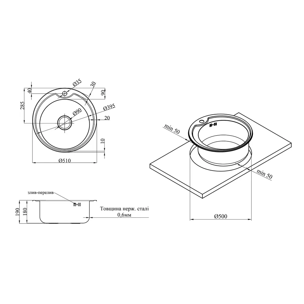 Мийка, сифон, злив-перелив, кошиковий вентиль, стрічка ущільнююча, кріплення.