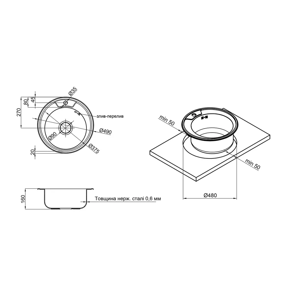 Мийка, сифон, злив-перелив, кошиковий вентиль, стрічка ущільнююча, кріплення.