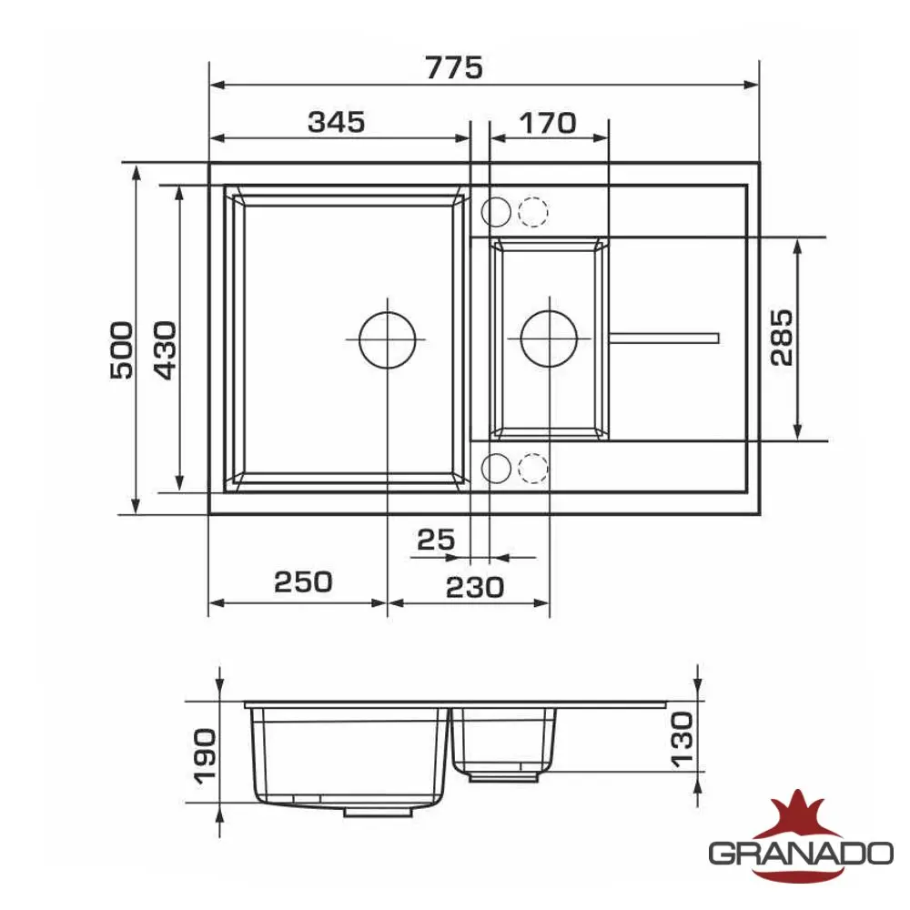 Конструкция мойки Granado Leon strong> имеет прямоугольную форму с длиной 765 мм., А для ее установки нужен шкаф 600-800 мм. P> При этом пространство мойки позволит избавить пространство кухни от посуды, овощей и фруктов, которые необходимо вымыть. За это отвечает большая чаша - непосредственно для мытья, а в меньшую можно высыпать яблоки или картофель, на просторное крыло составить чашки и бокалы. P> Продукция Granado < / strong> имеет необходимые заключения санитарно-эпидемиологической службы Украины и соответствует всем нормам качества. p> Модель Leon strong> является мойкой серии automatico, которые комплектуются сифоном с автоматическим клапаном и двумя готовыми отверстиями. p>