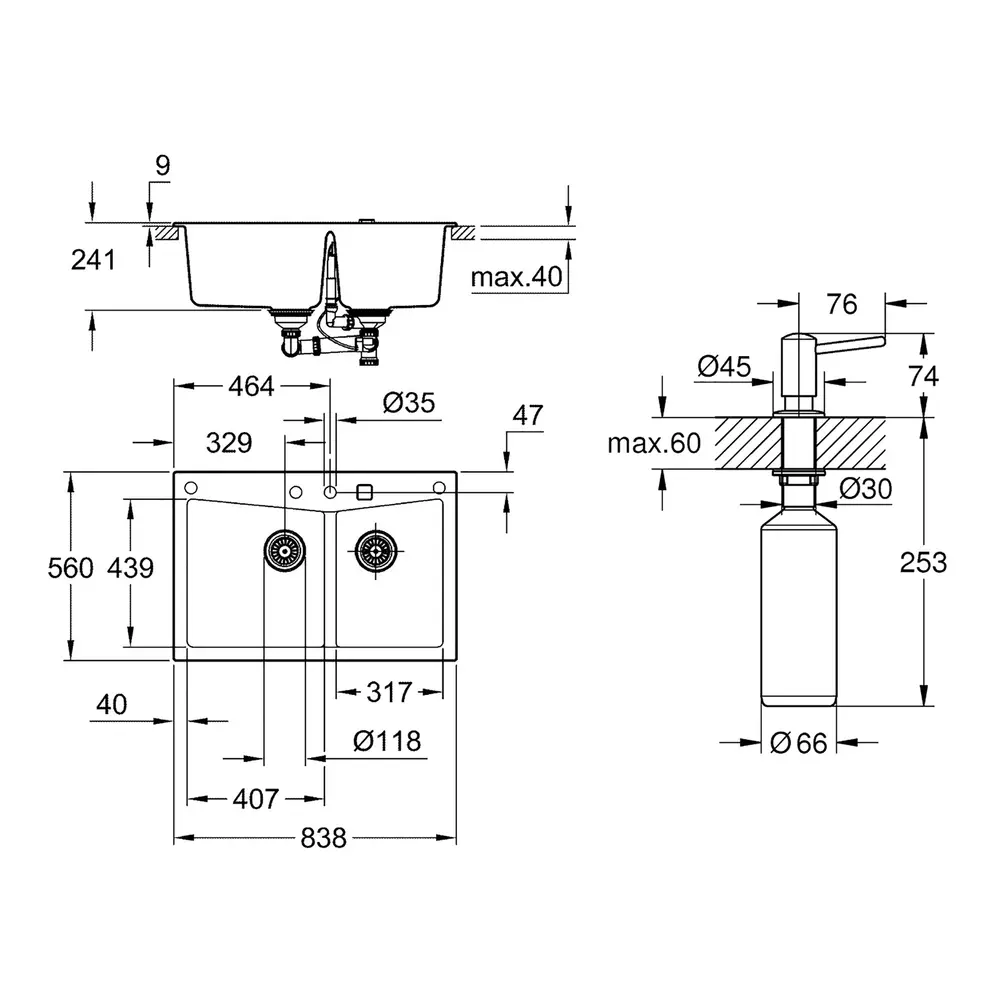 Набор Grohe мойка кухонная K700 31657AT0 + дозатор для моющего средства Contemporary 40536000 станет незаменимым атрибутом любой современной кухни. Мойка изготовлена ?? из кварцевого композита, который состоит из 80% кварца и 20% акриловой смолы и отвердителя. Изоляция GROHE Whisper на нижней части мойки уменьшает шум. Дозатор предназначен для хранения моющего средства или жидкого мыла. Он устанавливается под столешницу или под раковину. Объем резервуара - 500 мл.