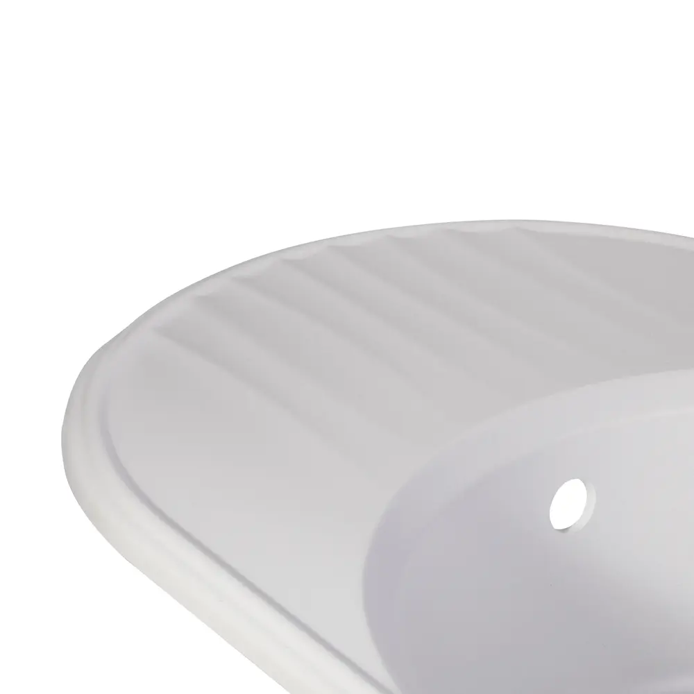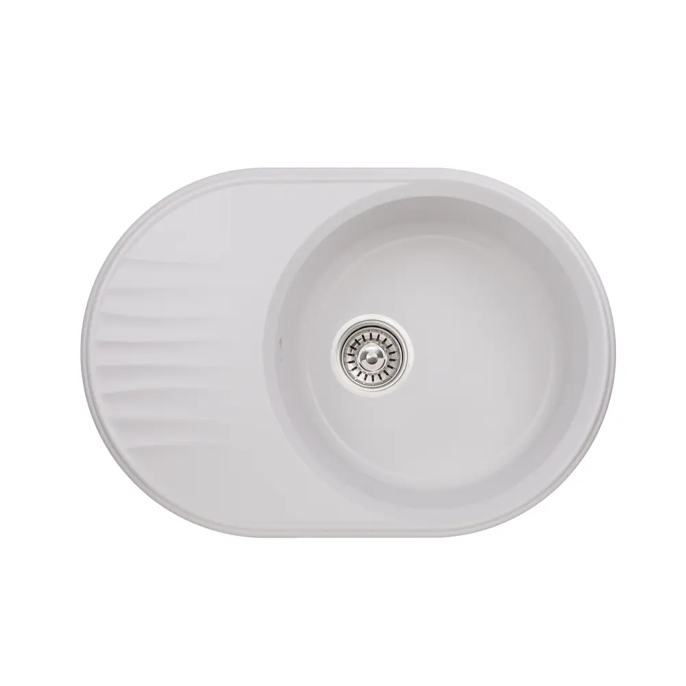 Кухонная мойка Qtap CS 7451 White (QT7451HI650) выполнена из искусственного камня, имеет матовую поверхность, придает ей привлекательный внешний вид. Изделие устойчиво к механическим повреждениям, а поверхность может выдержать температурные перепады. Такая мойка очищается от загрязнений без особых усилий. Она имеет вместительную круглую чашу, универсальное крыло для сушки продуктов и посуды и отверстие под перелив. Изделие монтируется врезным способом в отверстие в столешнице.