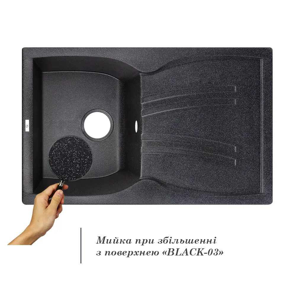 Кухонна мийка GF (BLA-03) 790x500/200 виготовлена з високоякісного граніту, має чорну матову поверхню, тому буде чудово виглядати зі змішувачем того ж кольору. Відмінна якість та дизайн мийки задовольнять найвибагливі побажання й створять затишок у вашому домі! Форма мийки прямокутна з гострими кутами. Виріб виконано з робочою чашею з отвором злив-перелив і втиснутим для стікання води ребристим крилом для сушіння посуду або розморожування продуктів. На борт нанесено фірмовий логотип виробника.