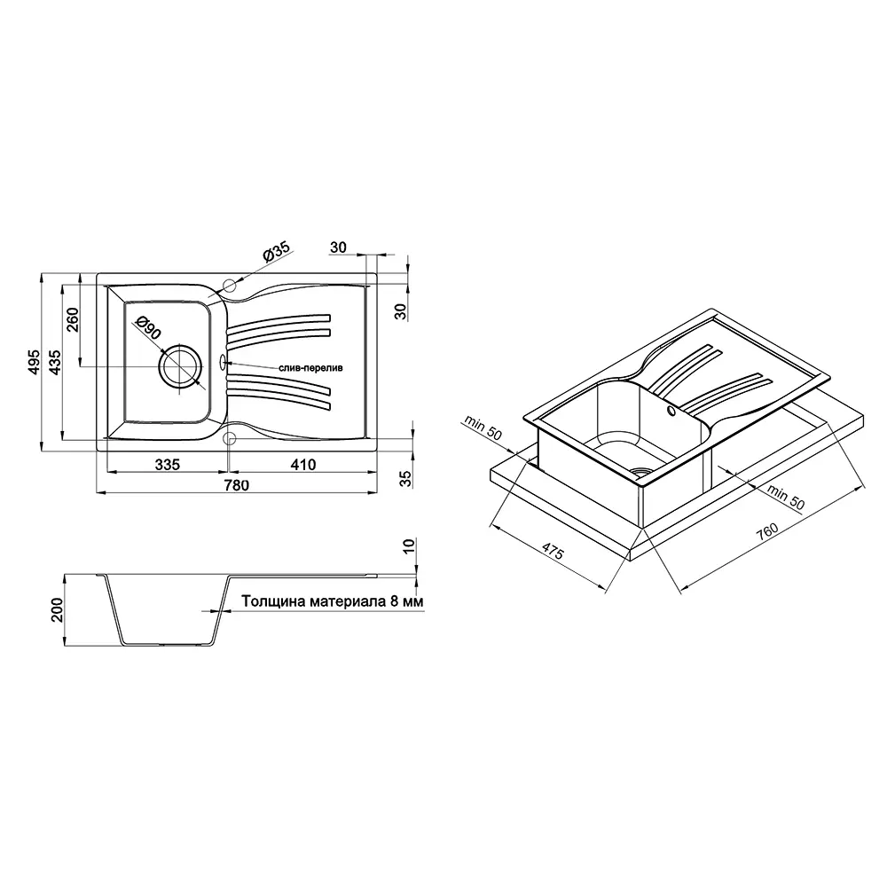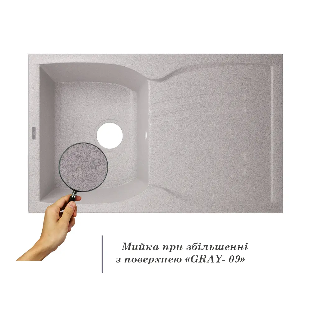 Кухонна мийка GF (GRA-09) 790x500/200 виготовлена з високоякісного граніту, має сіру матову поверхню, тому буде чудово виглядати зі змішувачем того ж кольору. Відмінна якість та дизайн мийки задовольнять найвибагливі побажання й створять затишок у вашому домі! Форма мийки прямокутна з гострими кутами. Виріб виконано з робочою чашею з отвором злив-перелив і втиснутим для стікання води ребристим крилом для сушіння посуду або розморожування продуктів. На борт нанесено фірмовий логотип виробника.