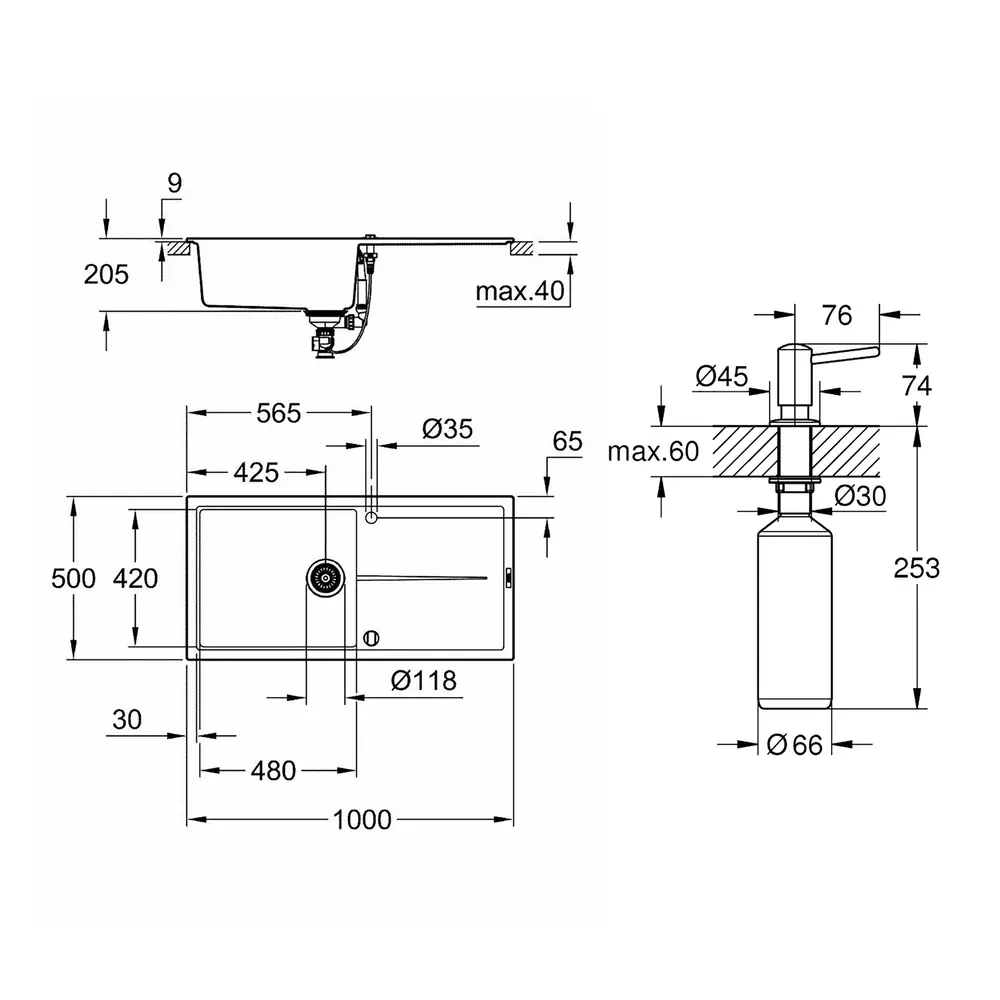 Набір Grohe мийка кухонна K400 31641AP0 + дозатор для миючого засобу Contemporary 40536000 стане незамінним атрибутом будь-якої сучасної кухні. Мийка виготовлена ??з кварцевого композиту, який складається з 80% кварцу і 20% акрилової смоли та затверджувача. Ізоляція GROHE Whisper на нижній частині мийки зменшує шум. Дозатор призначений для зберігання миючого засобу або рідкого мила. Він встановлюється під стільницю або під раковину. Обсяг резервуара - 500 мл.