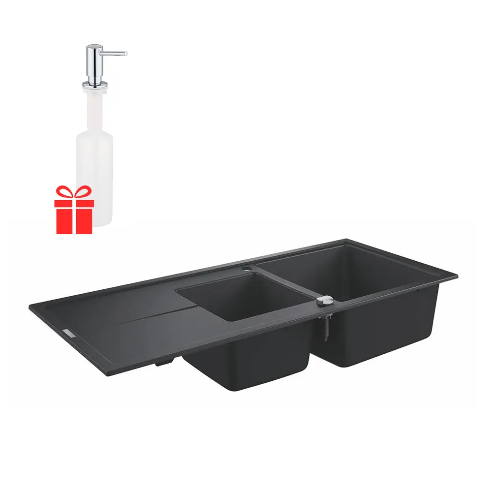 Набір Grohe мийка кухонна K400 31643AP0 + дозатор для миючого засобу Contemporary 40536000 стане незамінним атрибутом будь-якої сучасної кухні. Мийка виготовлена ??з кварцевого композиту, який складається з 80% кварцу і 20% акрилової смоли та затверджувача. Ізоляція GROHE Whisper на нижній частині мийки зменшує шум. Дозатор призначений для зберігання миючого засобу або рідкого мила. Він встановлюється під стільницю або під раковину. Обсяг резервуара - 500 мл.