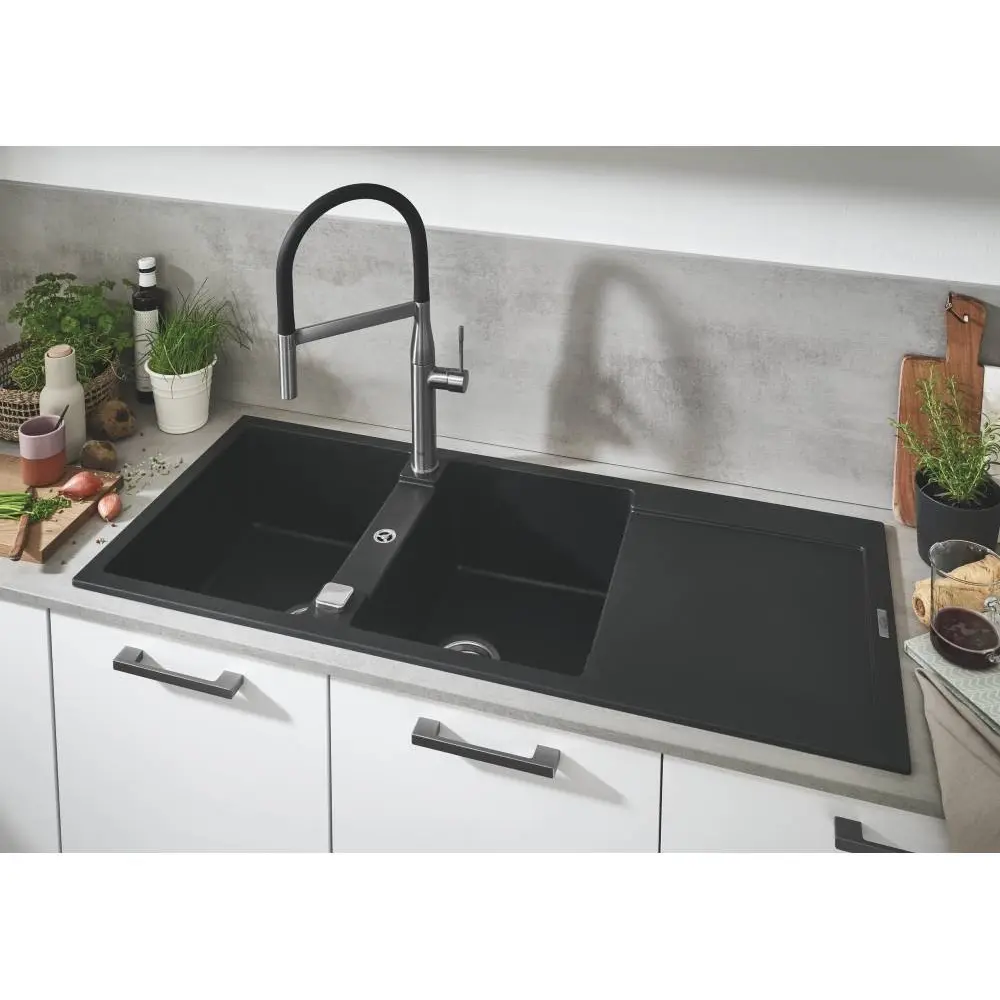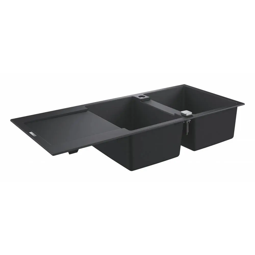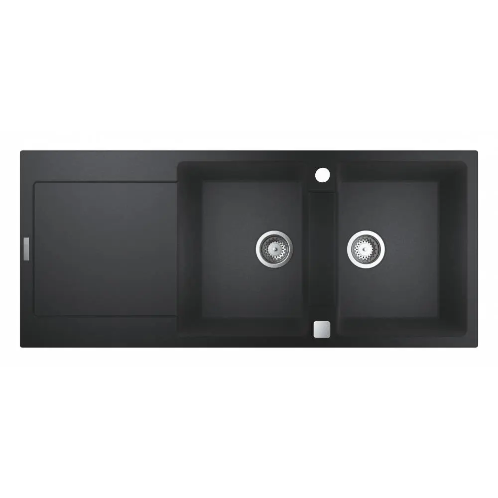 Кухонна мийка Grohe Sink 31647AP0 виготовлена з кварцового композиту, який складається з 80% кварцу та 20% акрилової смоли й затверджувача. Завдяки системі GROHE QuickFix установлення мийки не візьме багато часу та не потребує додаткового обладнання. Мийка виконана з двома робочими чашами, отвором для змішувача та крилом для сушіння посуду. Ізоляція GROHE Whisper на нижній частині мийки зменшує шум, а автоматичний сміттєзбірник з дистанційним управлінням дозволяє витягнути пробку.