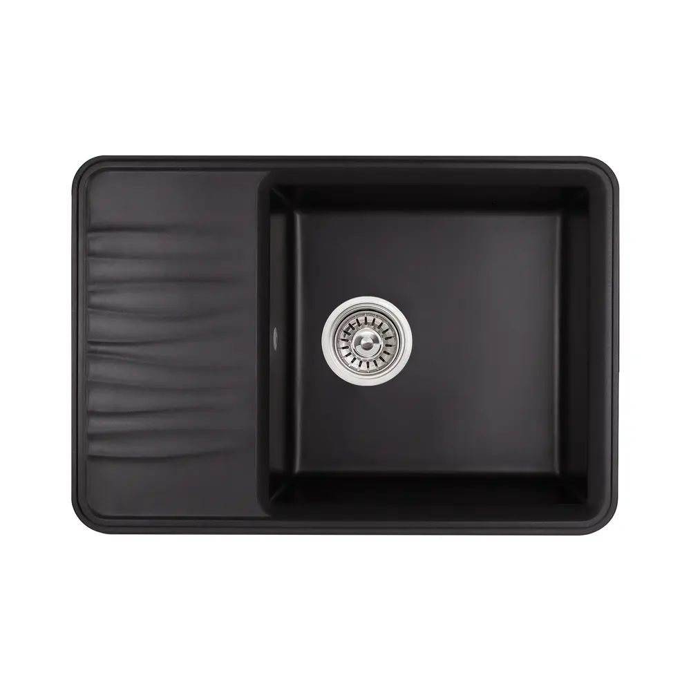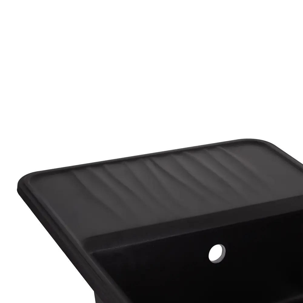 Кухонна мийка Qtap CS 7440 Black (QT7440BLA404) виготовлена ??з якісного штучного каменю з матовою поверхнею. Виріб з такого матеріалу досить стійкий до механічних пошкоджень, а поверхня витримує температурні перепади. Така мийка досить просто очищується від забруднень. Вона має містку прямокутну чашу, оригінальне крило для сушки посуду і отвір під перелив. Виріб монтується урізним способом в отвір в стільниці.