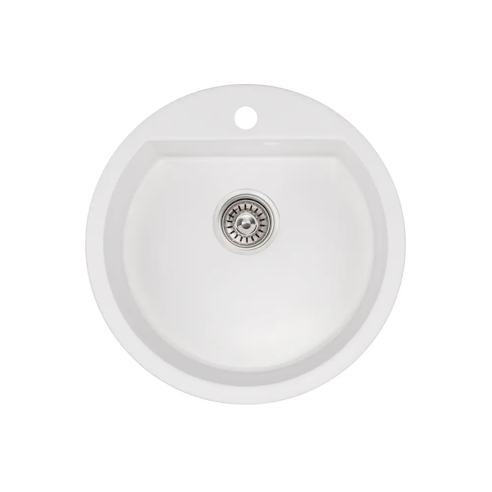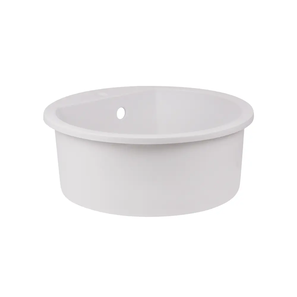 Кухонна мийка Qtap CS D510 White (QTD510WHI650) виконана з якісного штучного каменю, має матову поверхню, що надає їй привабливий зовнішній вигляд. Виріб стійкий до механічних пошкоджень, а поверхня може витримати температурні перепади. Така мийка очищується від забруднень без особливих зусиль. Вона має містку круглу чашу, отвір під змішувач і отвір під перелив. Виріб монтується урізним способом в отвір в стільниці.