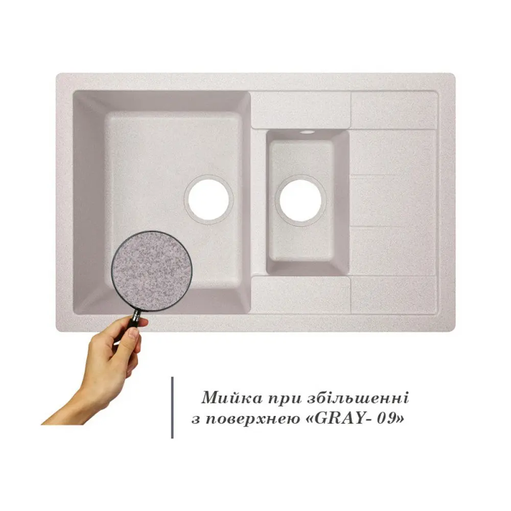 Кухонна мийка Lidz (GRA-09) 780x495/200 виготовлена з якісного штучного каменю, має сіру матову поверхню, тому буде чудово виглядати зі змішувачем того ж кольору. Відмінна якість та дизайн мийки задовольнять найвибагливі вимоги. Вона виконана з робочою чашею, додатковою для розморожування продуктів з отвором злив-перелив та ребристим крилом для сушіння посуду. Кухонна мийка монтується урізним способом в отвір в стільниці.