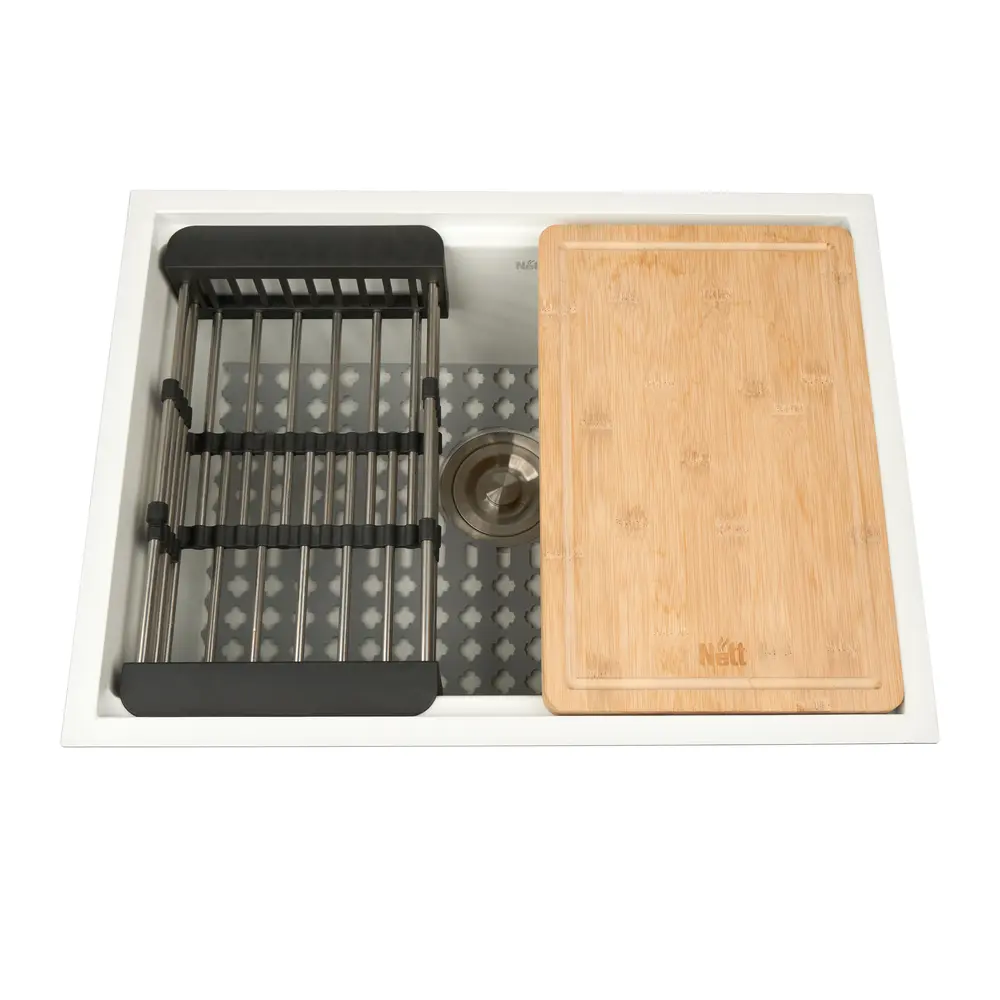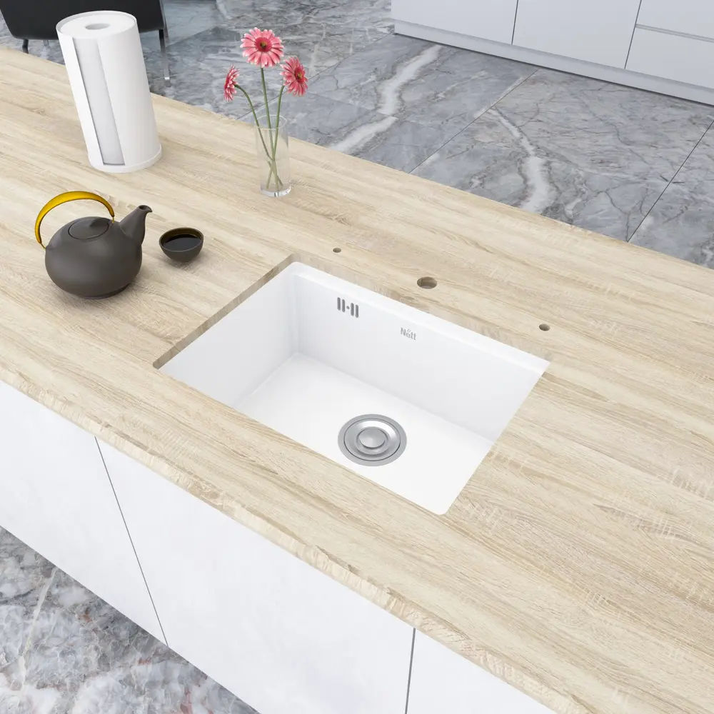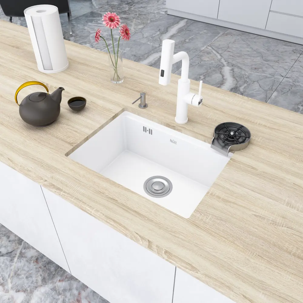 Елегантна біла раковина виготовлена з високоякісної нержавіючої сталі AISI 304, що забезпечує надійність та тривалий термін служби виробу.