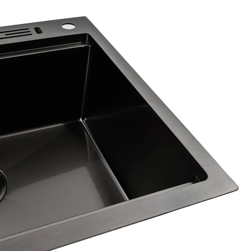 Обновите свою кухню с Кухонной черной мойкой PVD 60х50 Platinum Handmade с подставкой для ножей, которая не только привлекает своим стильным дизайном, но и обеспечивает максимальную функциональность и удобство в ежедневном использовании!