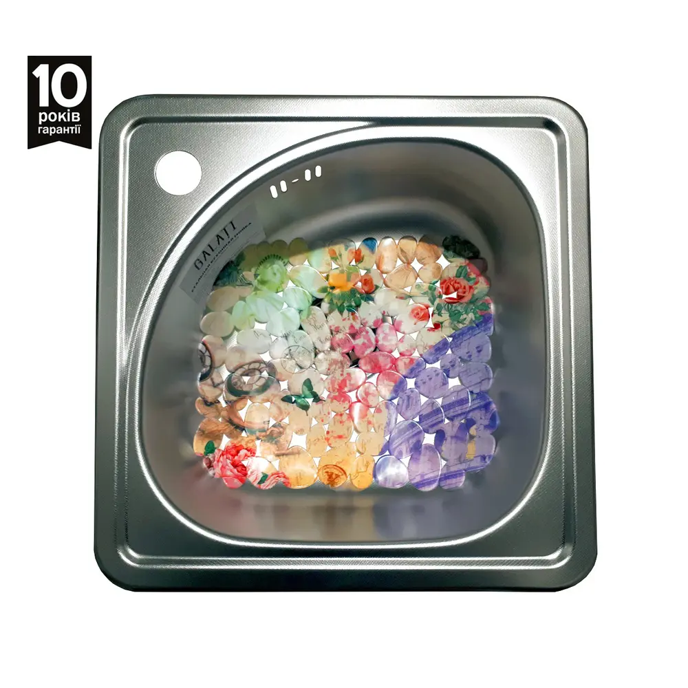 Сталева раковина кухонна Galaţi Mala Nova Textură 38 * 38 квадратна. Має красиву декоровану поверхню (мікро- орнамент). Гарантія 10 років.